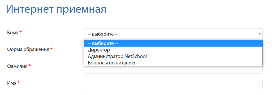 Форма обратной связи для родителей обучающихся и ответы на вопросы родителей по питанию. (в выпадающем списке формы нужно выбрать (Вопросы по питанию)