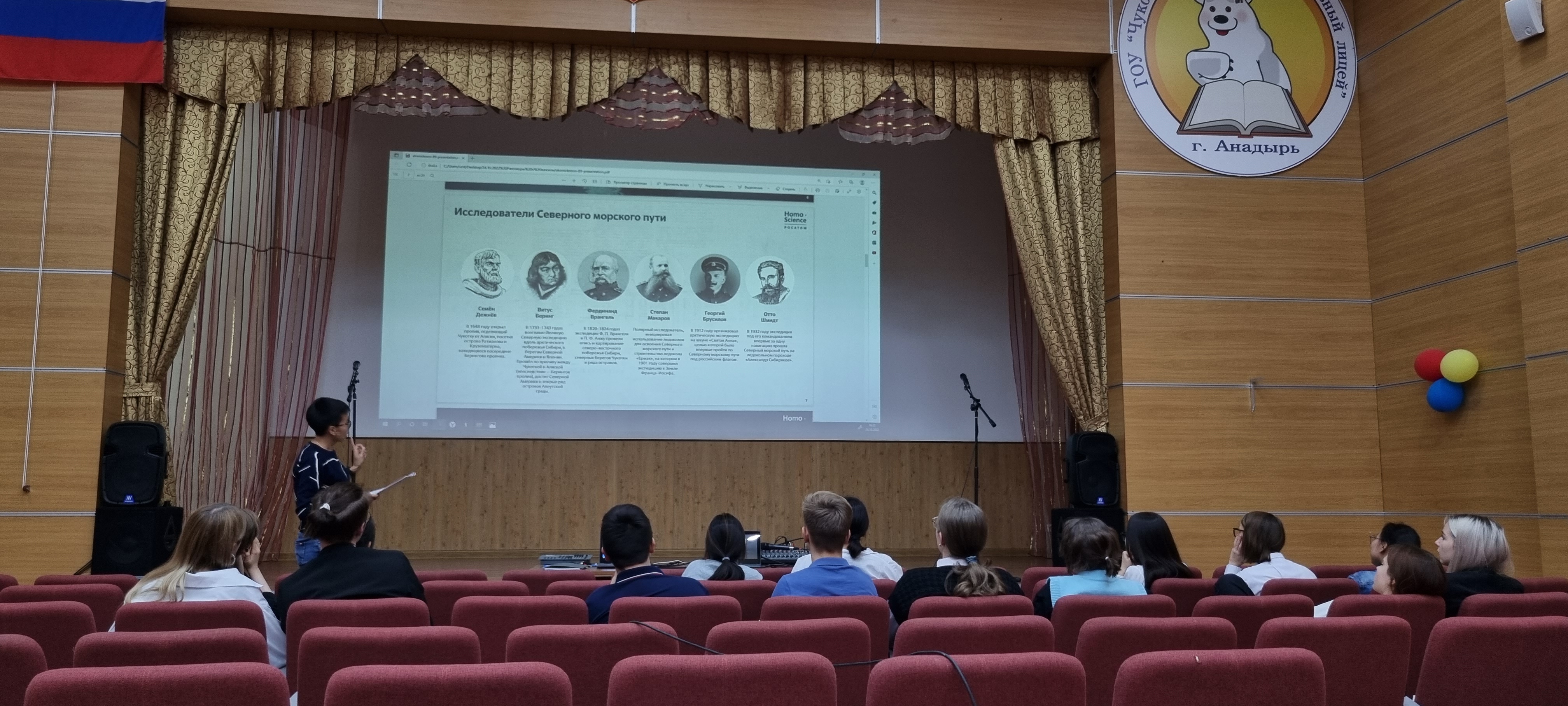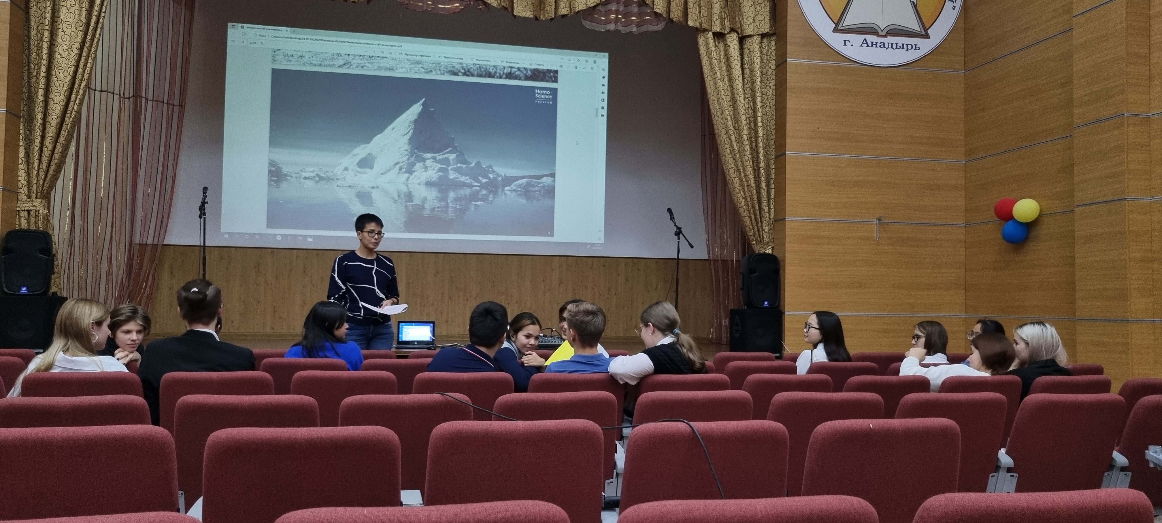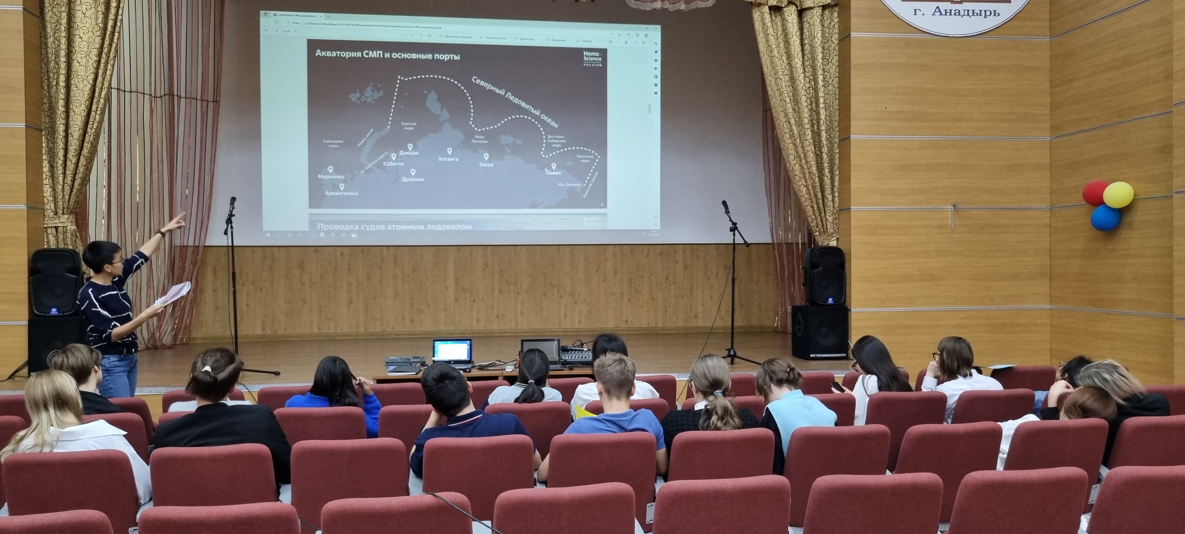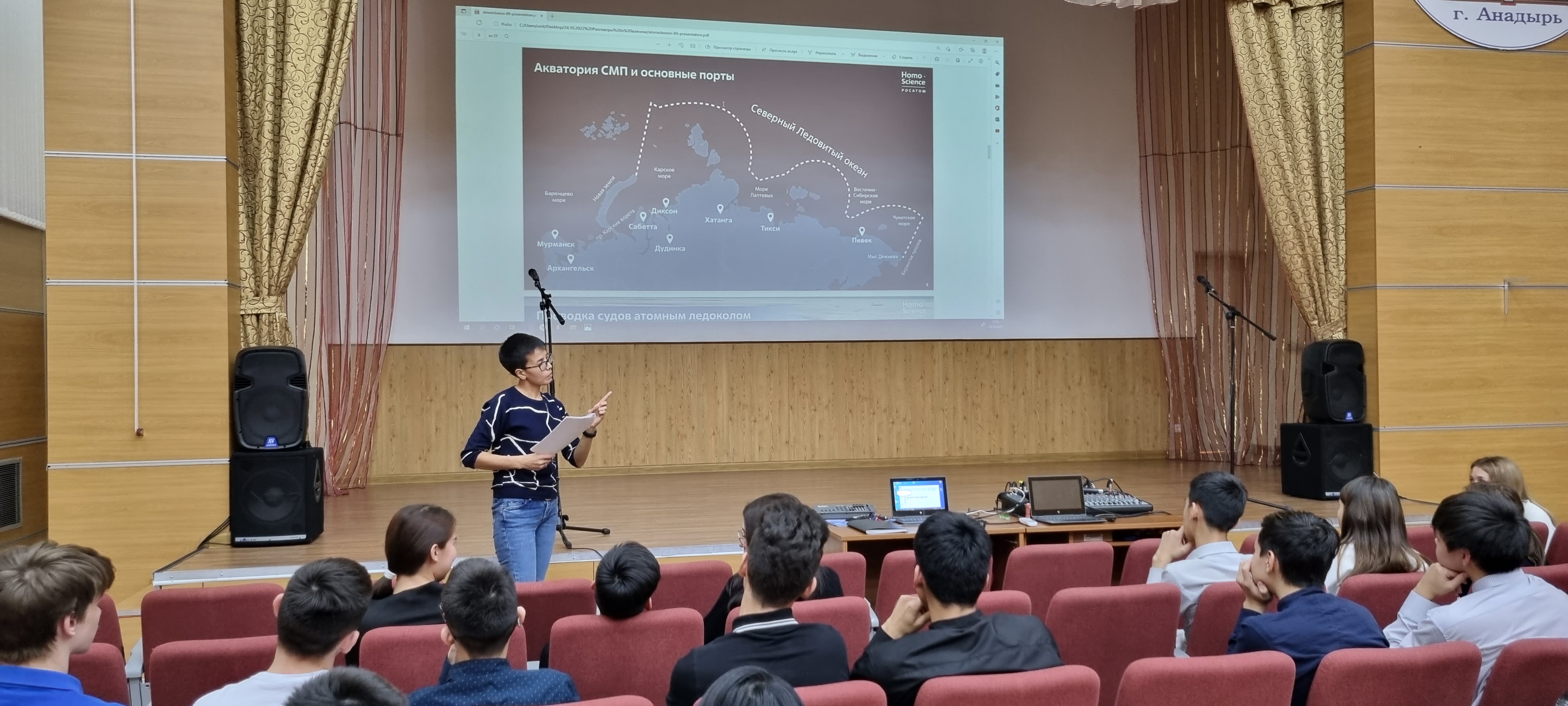 В Чукотском окружном профильном лицее продолжаются уроки в рамках проекта «Разговоры о важном».  24 октября 2022 года среди обучающихся 8-х и 11-х классов (46 человек) прошло занятие на тему «Россия – мировой лидер атомной отрасли». Цель урока - знакомство с Северным морским путем и его значением, ролью атомного ледокольного флота в развитии российской Арктики. В процессе урока была предусмотрена работа в группах: министерства транспортного, экономического и социального развития. Задачами министерств стало определить проблемы рационального развития арктического региона, занимающего 18 % всей территории России, а также предложить пути решения проблем. Ребята узнали много нового, в частности, что у России имеется атомный ледокольный флот (единственный в мире), что регион является, хоть и малонаселённым, но очень перспективным в экономическом отношении. Также ребята вспомнили имена российских первооткрывателей, таких как С. Дежнев, В. Беринг, Г. Седов, Ф. Врангель, О. Шмидт, С. Макаров, Г. Брусилов и др., преподаватель наглядно продемонстрировал на карте Северный морской путь, который играет огромное значение не только для внутреннего развития России, но и для международной торговли. Самым интересным моментом урока стало то, что ребята узнали о возможности принятия участия в просветительском проекте «Ледокол знаний. Homo Science project» для школьников России. В данном проекте может принять участие любой школьник от 12 до 16 лет и побороться за право стать участником просветительской экспедиции на Северный полюс на атомном ледоколе «50 лет Победы» летом 2023 года.