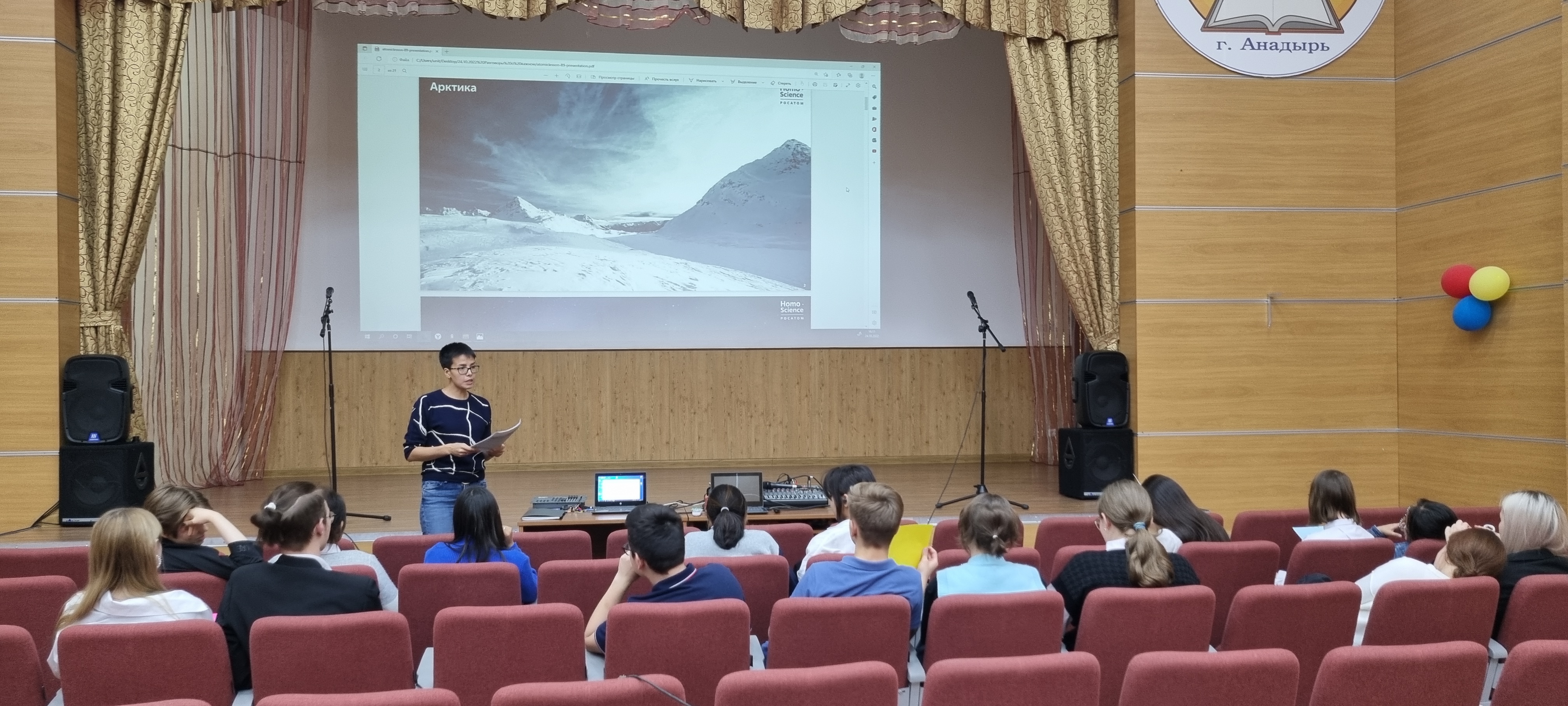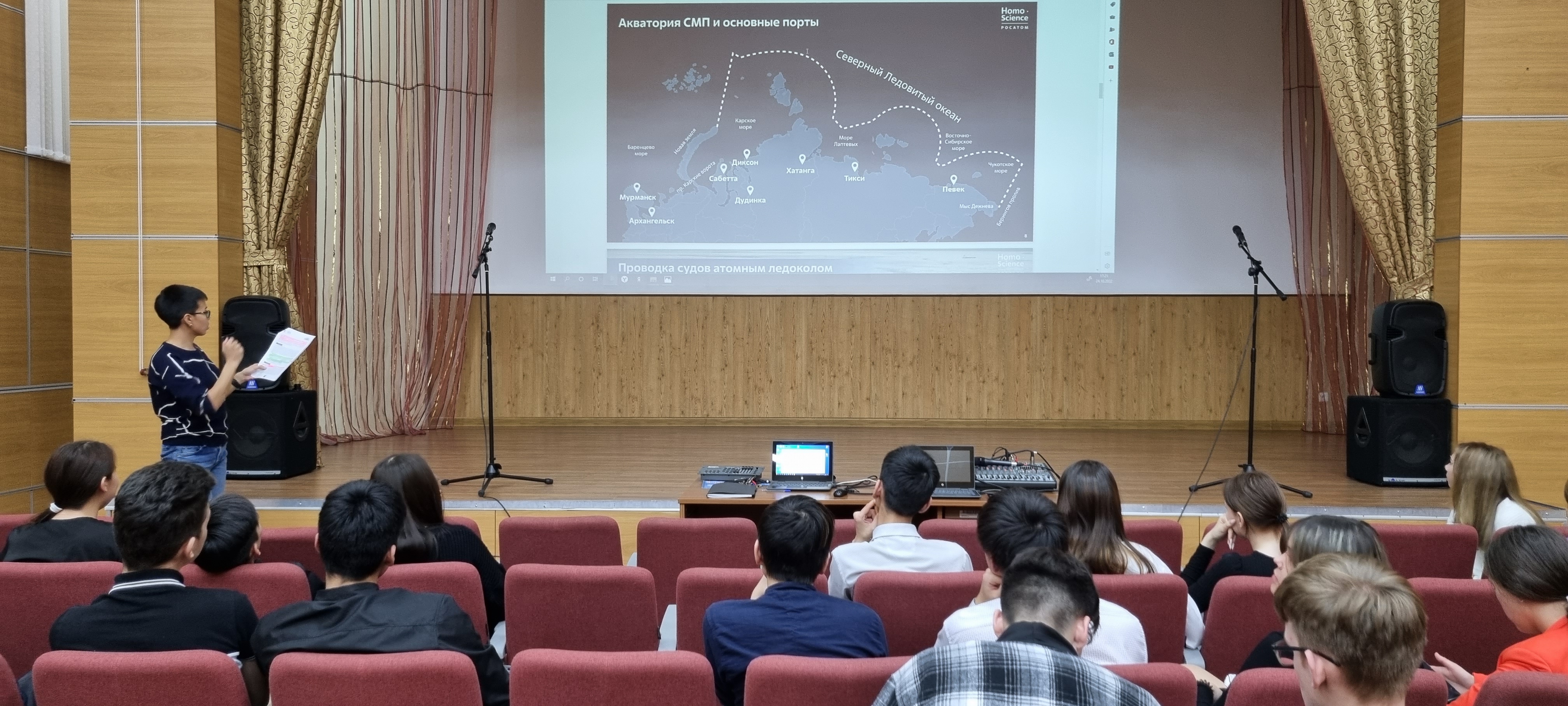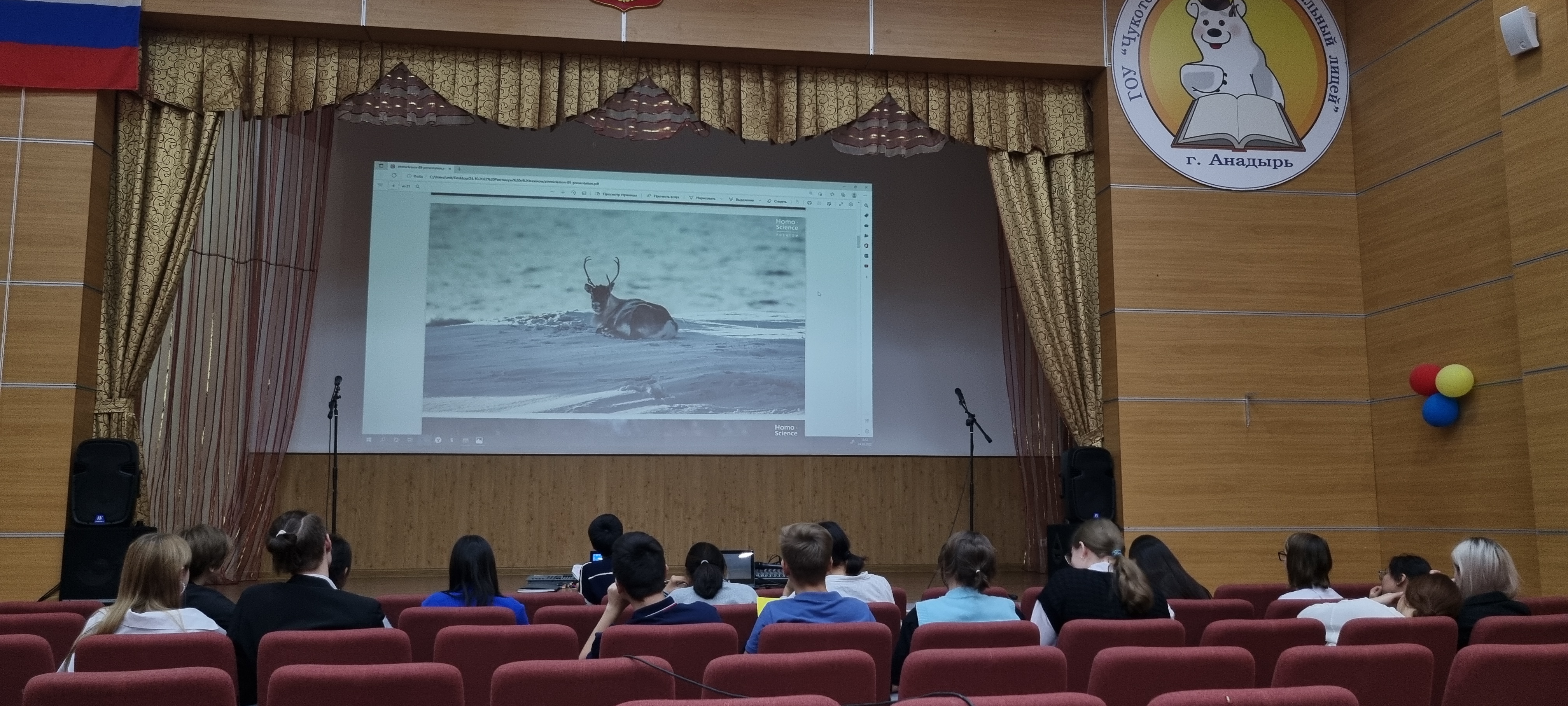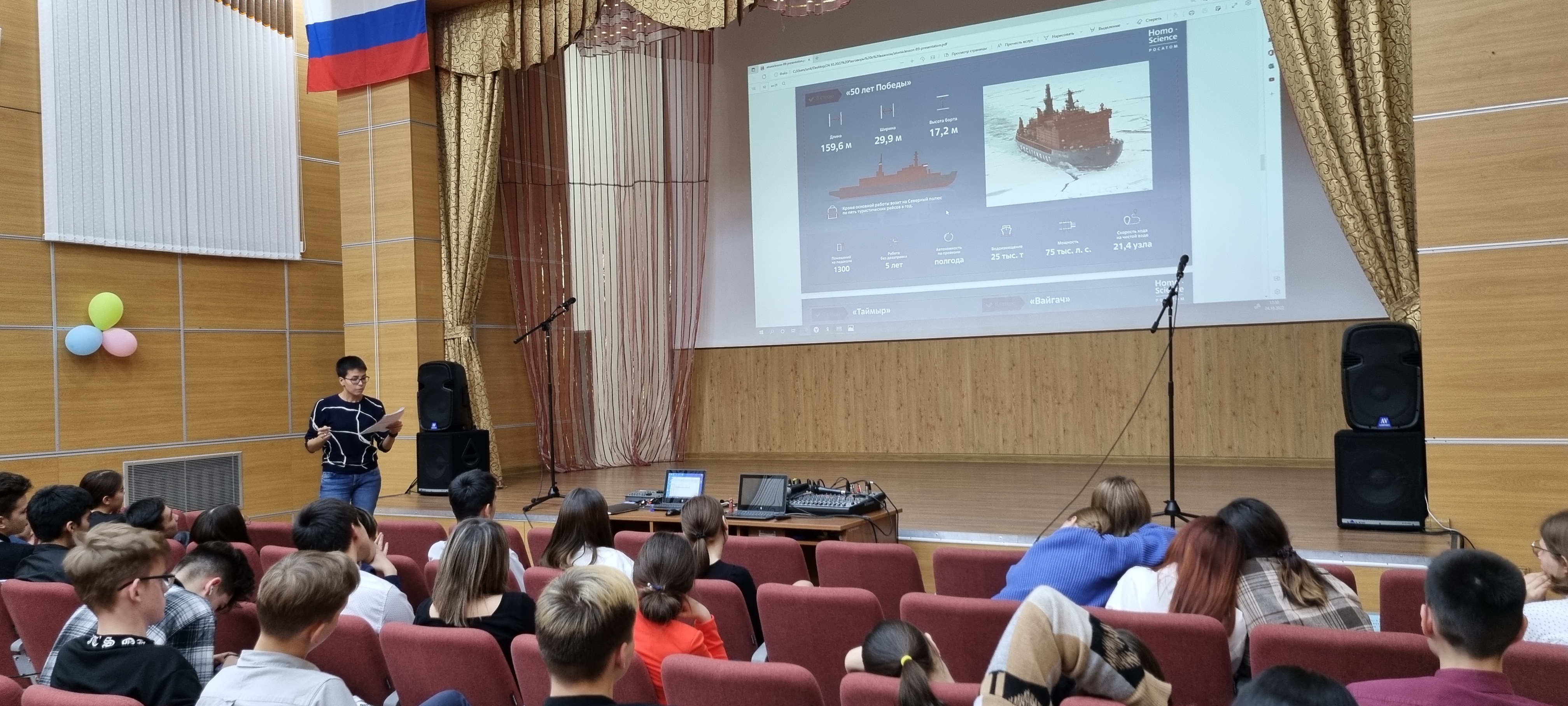 В Чукотском окружном профильном лицее продолжаются уроки в рамках проекта «Разговоры о важном».  24 октября 2022 года среди обучающихся 8-х и 11-х классов (46 человек) прошло занятие на тему «Россия – мировой лидер атомной отрасли». Цель урока - знакомство с Северным морским путем и его значением, ролью атомного ледокольного флота в развитии российской Арктики. В процессе урока была предусмотрена работа в группах: министерства транспортного, экономического и социального развития. Задачами министерств стало определить проблемы рационального развития арктического региона, занимающего 18 % всей территории России, а также предложить пути решения проблем. Ребята узнали много нового, в частности, что у России имеется атомный ледокольный флот (единственный в мире), что регион является, хоть и малонаселённым, но очень перспективным в экономическом отношении. Также ребята вспомнили имена российских первооткрывателей, таких как С. Дежнев, В. Беринг, Г. Седов, Ф. Врангель, О. Шмидт, С. Макаров, Г. Брусилов и др., преподаватель наглядно продемонстрировал на карте Северный морской путь, который играет огромное значение не только для внутреннего развития России, но и для международной торговли. Самым интересным моментом урока стало то, что ребята узнали о возможности принятия участия в просветительском проекте «Ледокол знаний. Homo Science project» для школьников России. В данном проекте может принять участие любой школьник от 12 до 16 лет и побороться за право стать участником просветительской экспедиции на Северный полюс на атомном ледоколе «50 лет Победы» летом 2023 года.