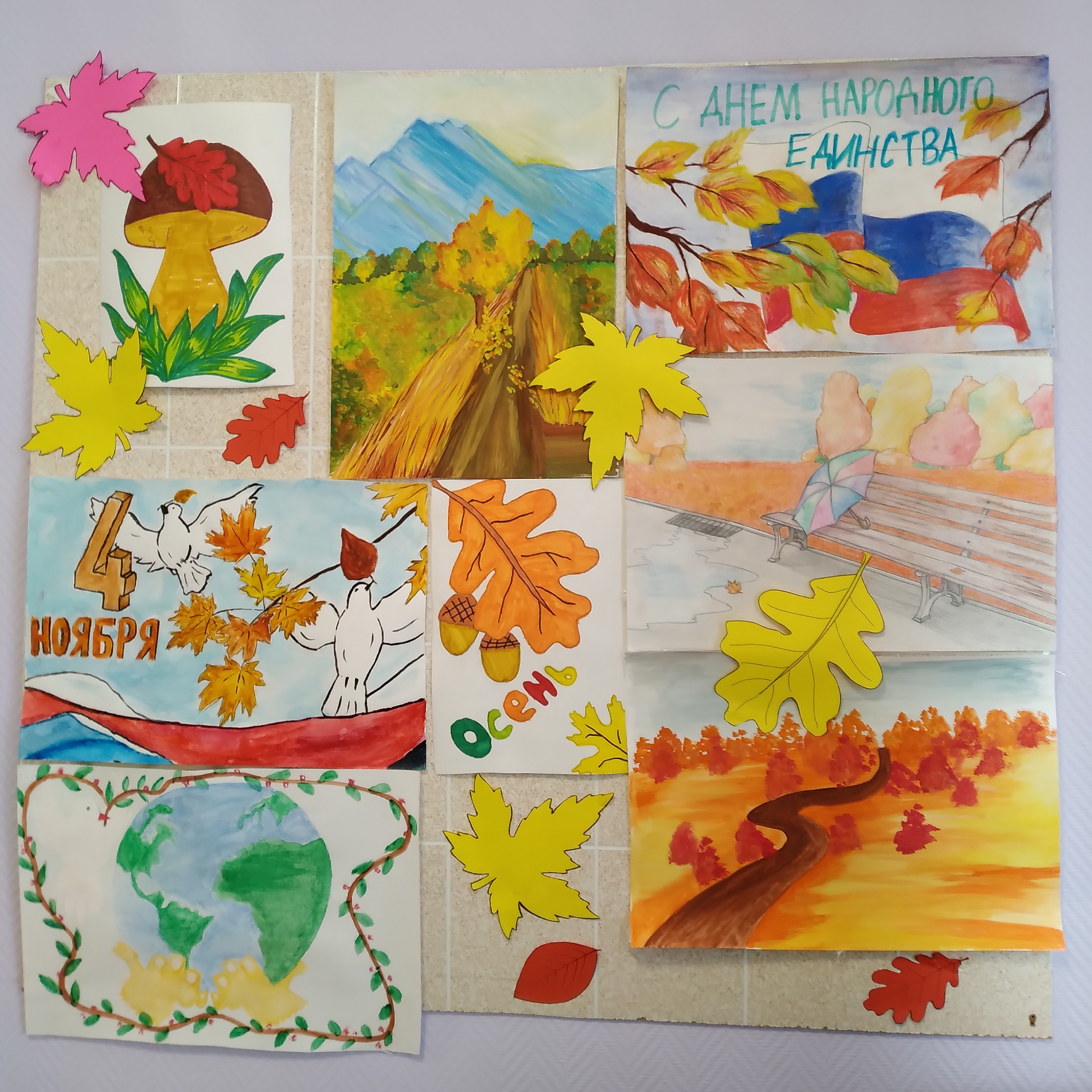 Результатом «Нескучной осени» стала общая фотография с завершенными работами. Яркие краски осени, застывшие в рисунках, нашли свое место на стенде в воспитательской.
