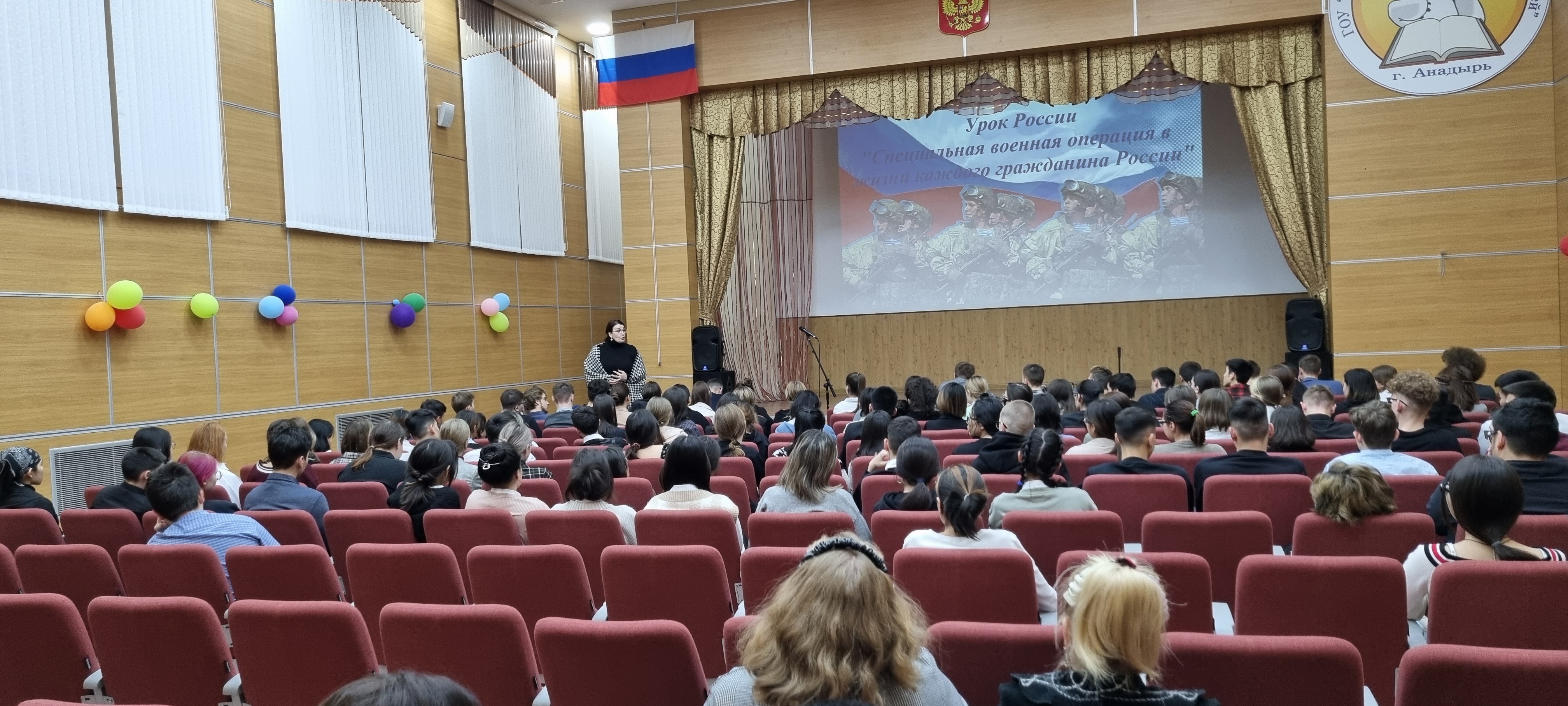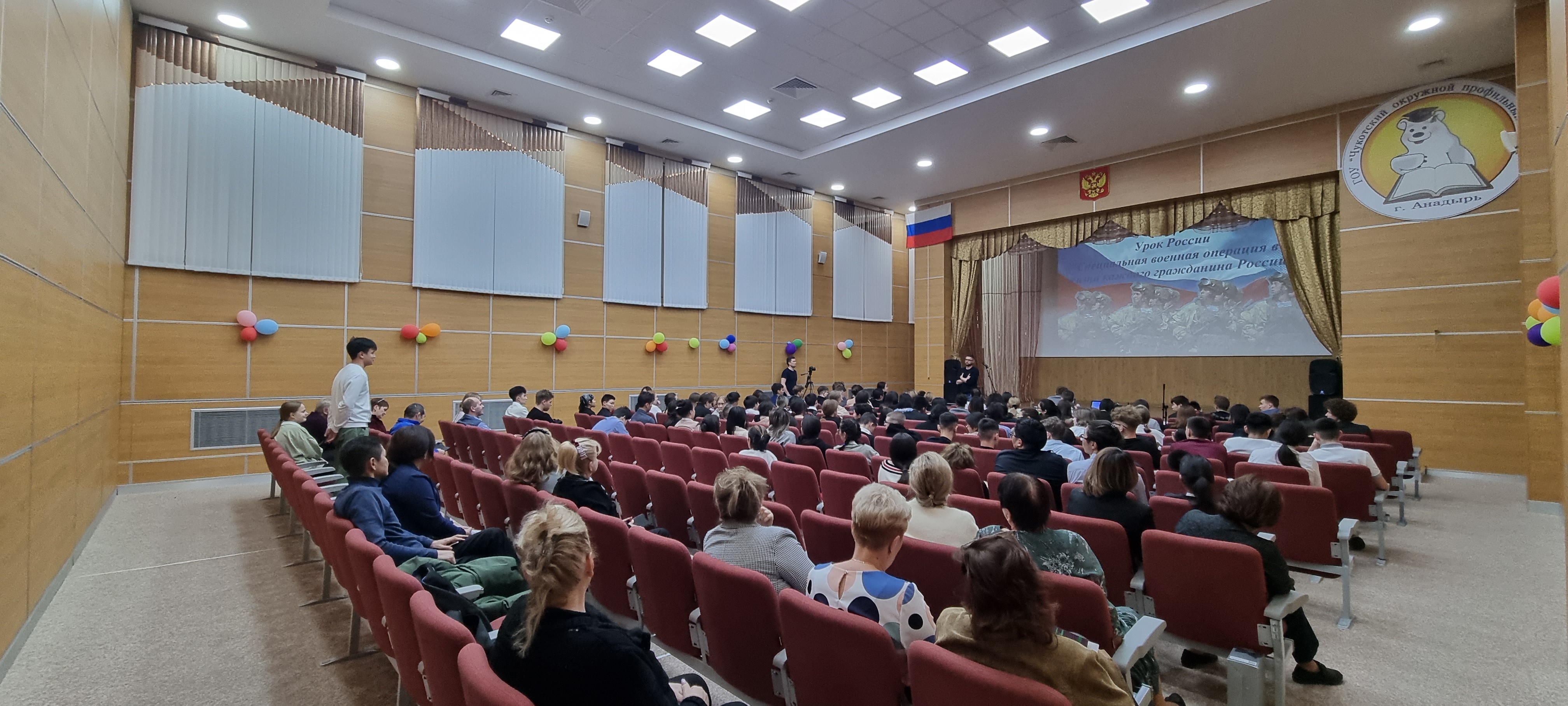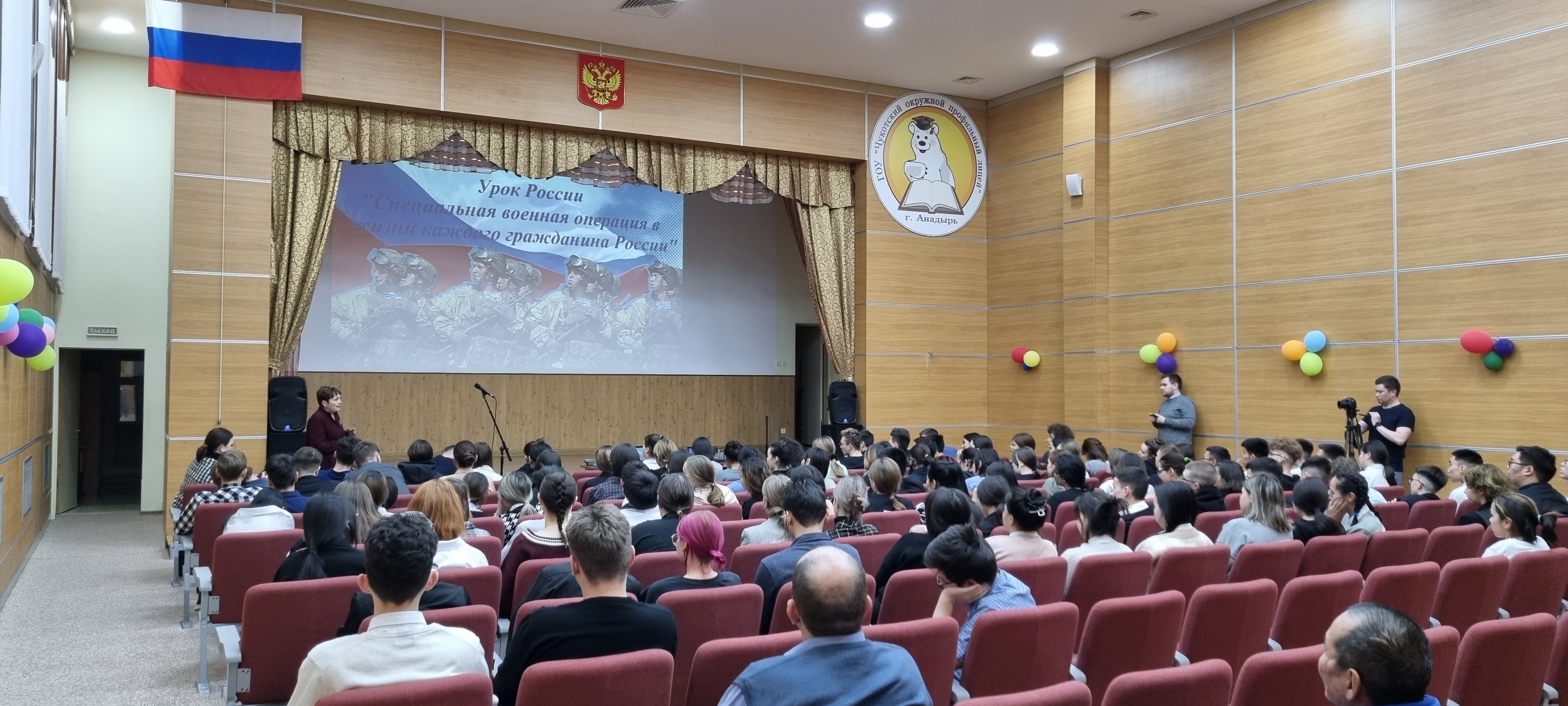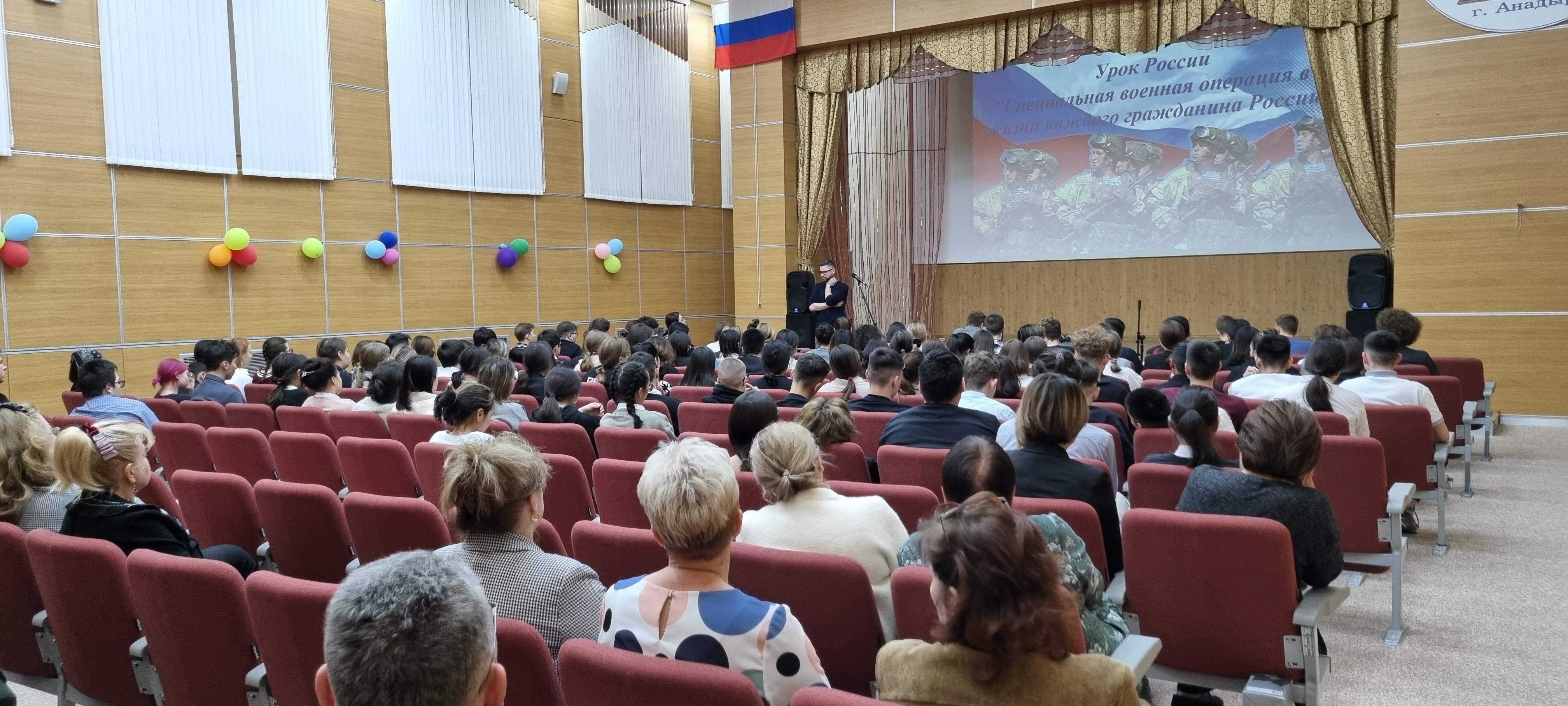 24 ноября 2022 года в актовом зале Чукотского окружного профильного лицея прошла встреча обучающихся 8-11 классов с Главой регионального исполкома Общероссийского народного фронта в Чукотском автономном округе Вакарик Аленой Вячеславовной и Клоссом Денисом Аркадьевичем – участником событий на Донбассе в 2014 году, заведующим отделением травматологии ГУЗ «Чукотская окружная больница». Тема встречи «Урок России «Специальная военная операция в жизни каждого гражданина России».