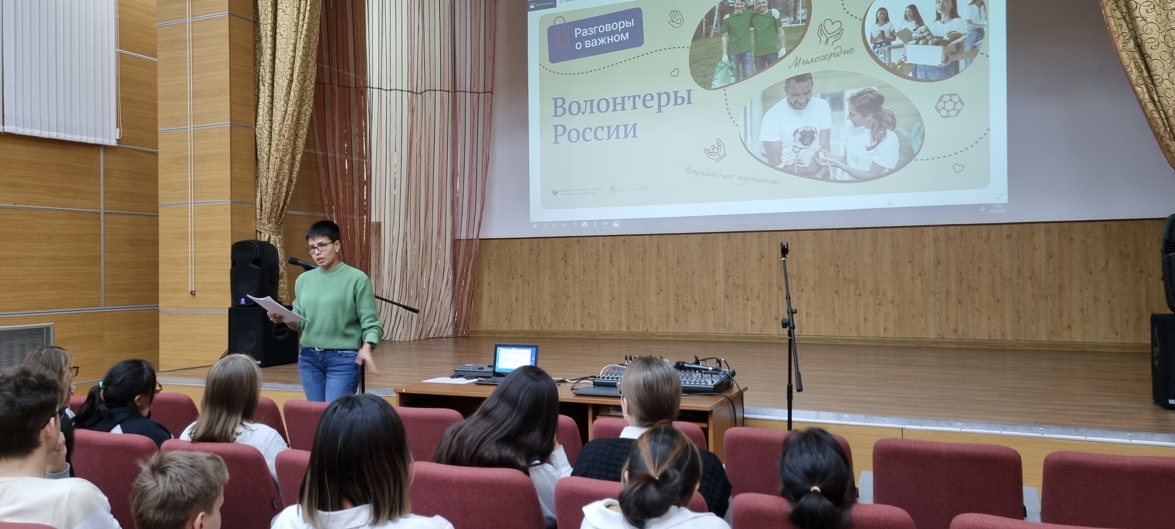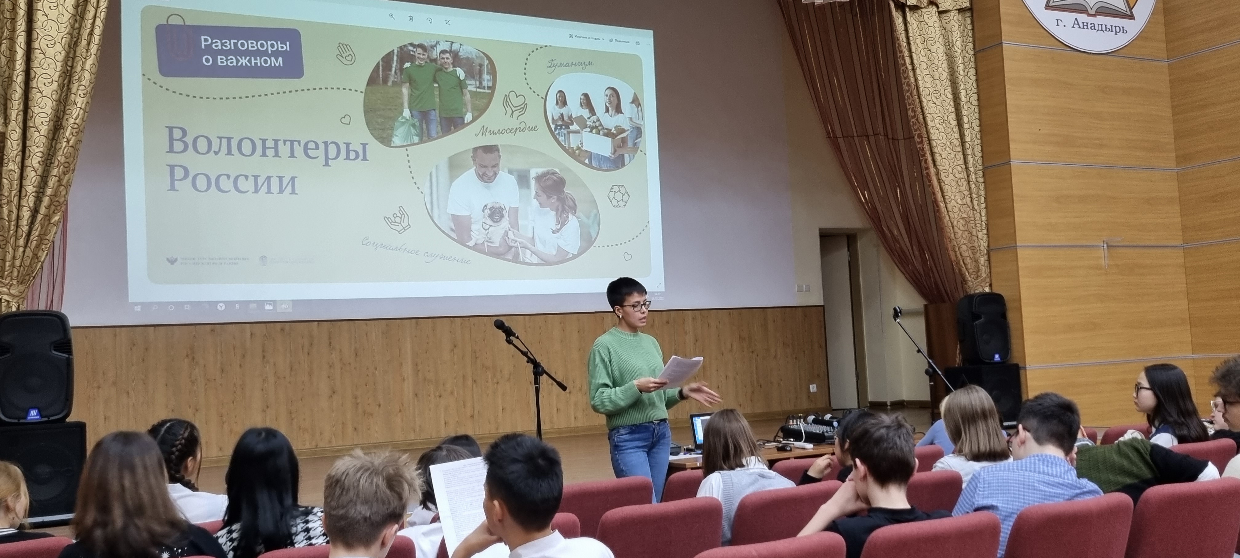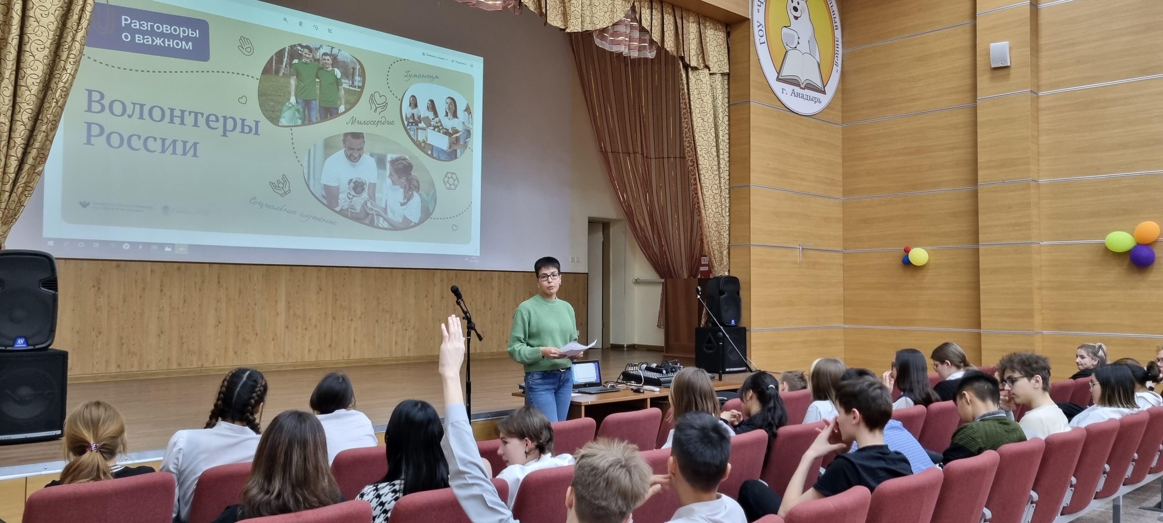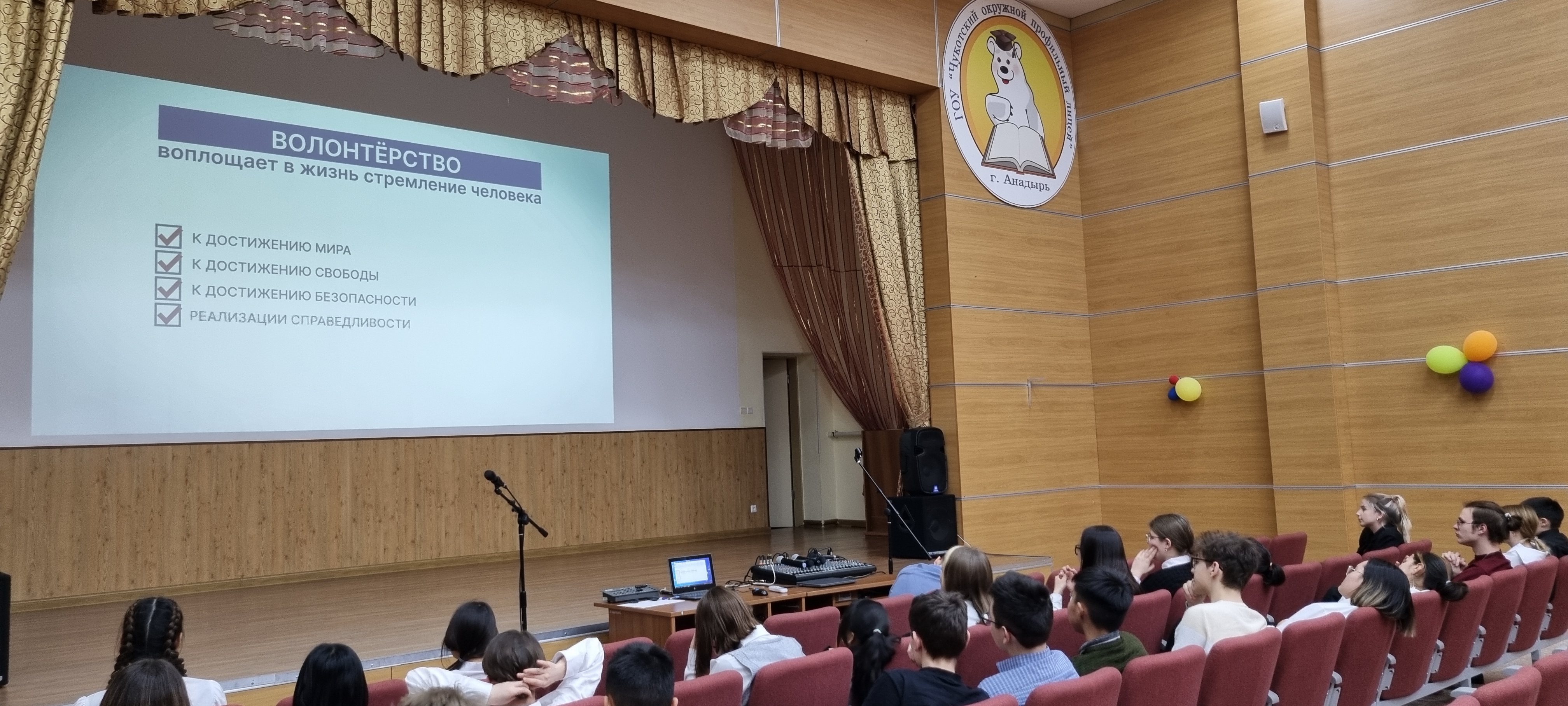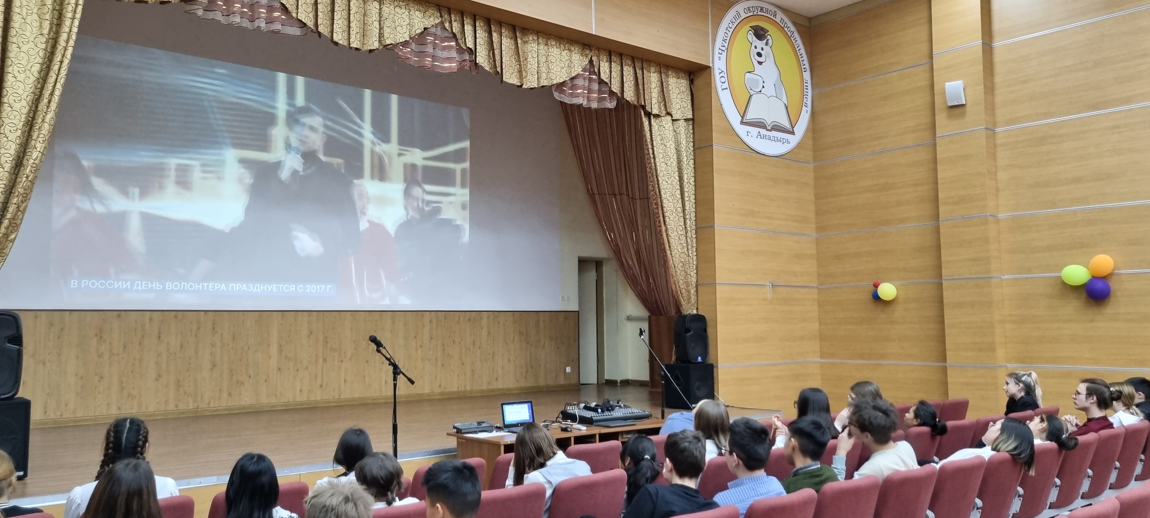 05 декабря 2022 года в актовом зале Чукотского окружного профильного лицея для обучающихся 8-х и 11-х классов прошел урок из цикла «Разговоры о важном» на тему «День волонтера». Цель - формирование представления о жизни как проявлении себя в различных видах волонтёрской деятельности, самореализации в конкретных действиях и поступках; воспитание нравственных качеств личности как доброта, милосердие, сострадание, благородство, готовность прийти на помощь.
