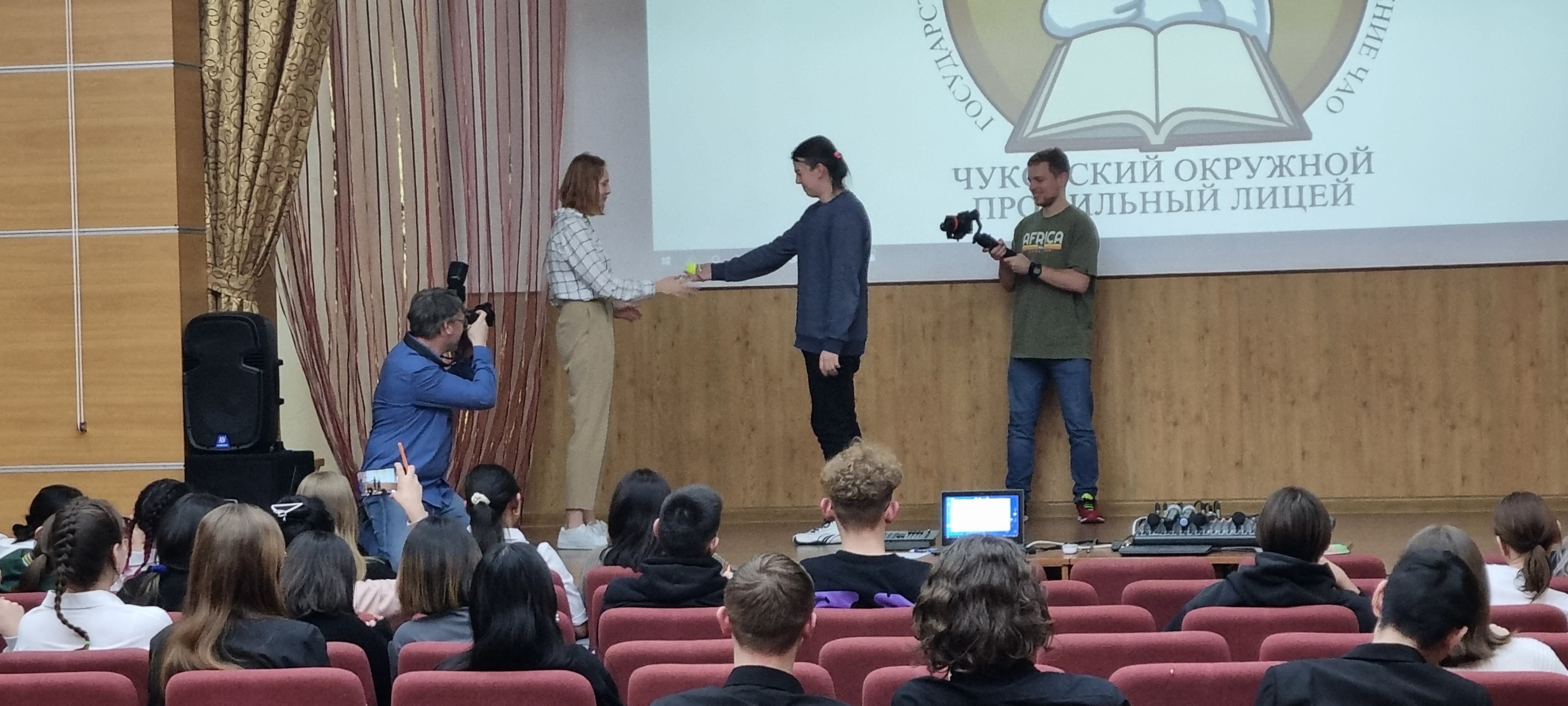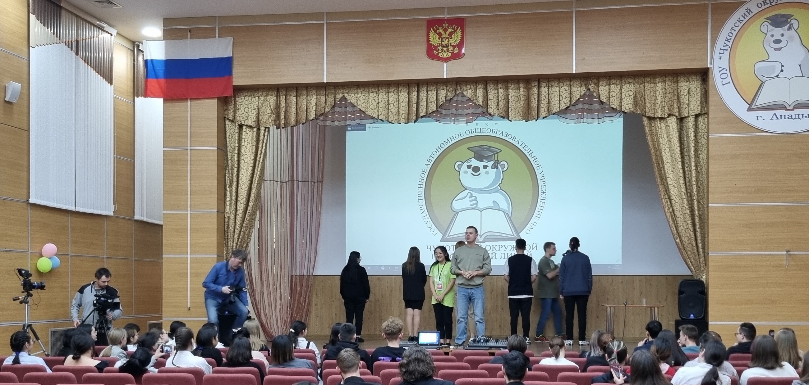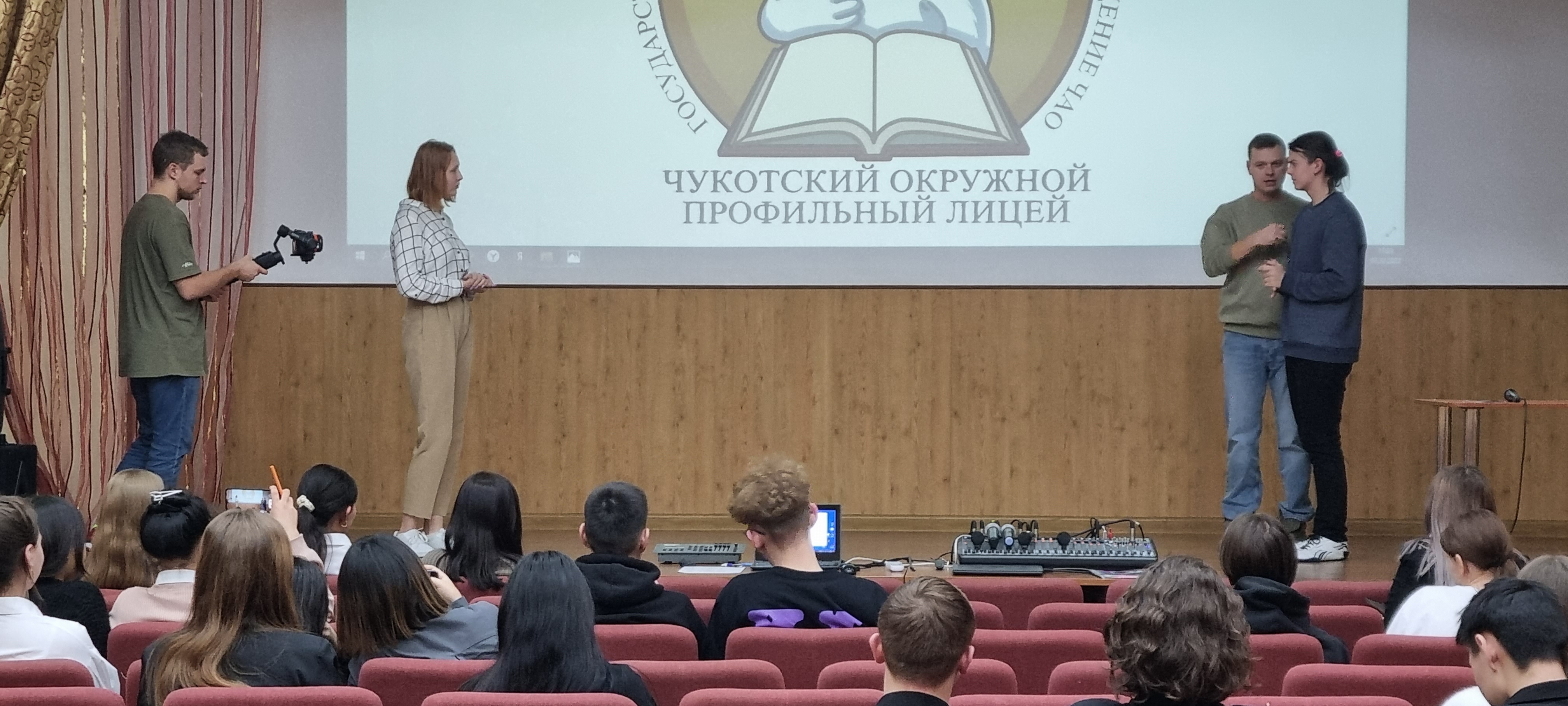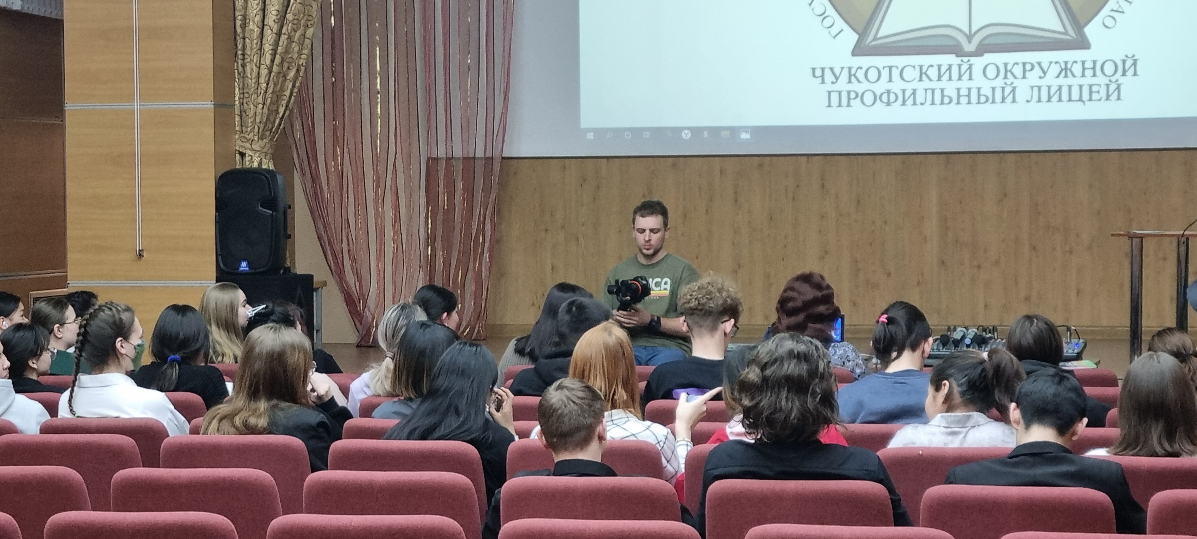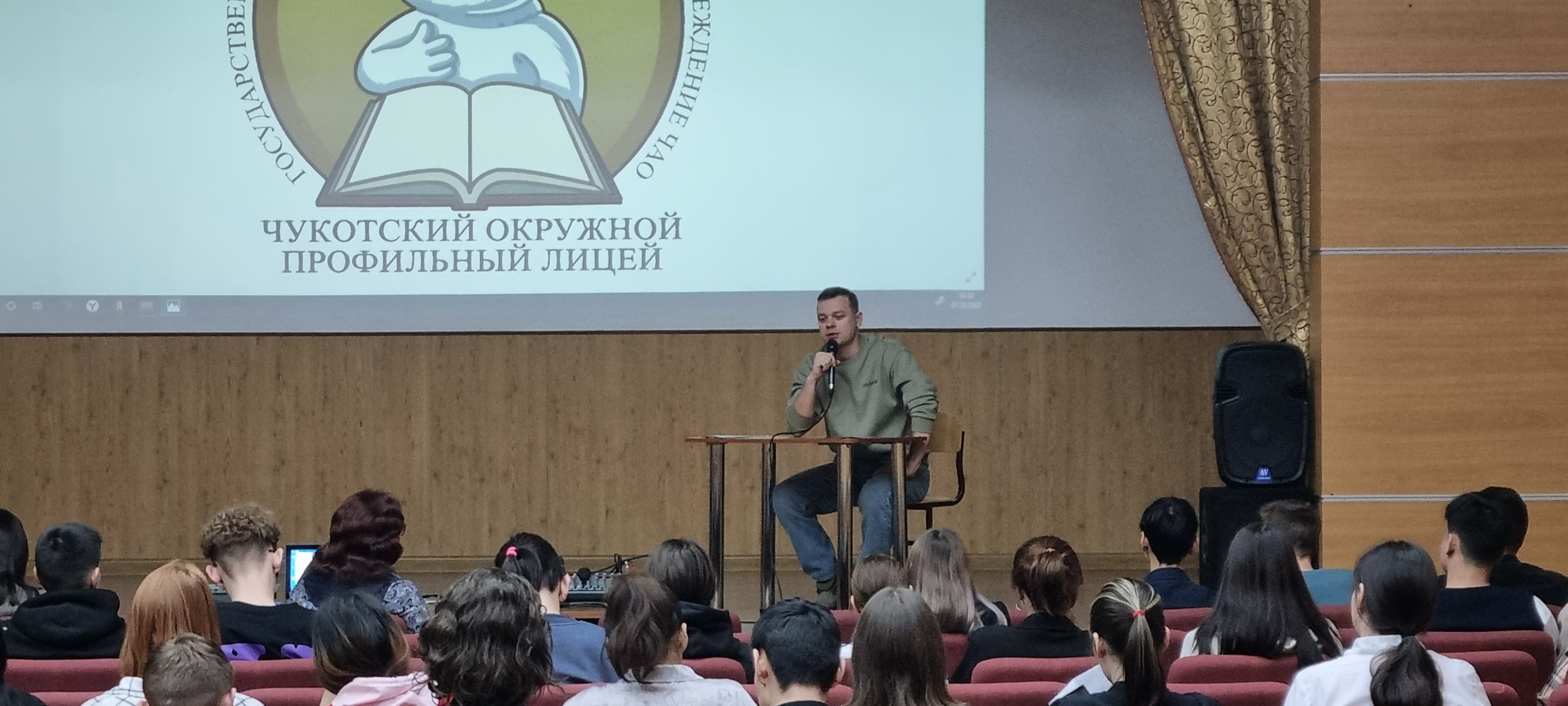 07 декабря 2022 года в актовом зале Чукотского окружного профильного лицея обучающиеся встретились с актером театра и кино Владом Канопкой – перспективным актером, звездой сериала «Молодежка». Возможность встретиться с любимцем публики появилась благодаря тому, что при поддержке президентского фонда культурных инициатив и Правительства Чукотского окружного округа в г. Анадырь проходит шестой арктический международный кинофестиваль «Золотой ворон». Цель – поделиться с ребятами опытом работы, рассказать об актерских буднях. Встреча прошла в два этапа: в формате «вопрос-ответ» и небольшого мастер-класса, в котором лицеисты приняли активное участие.