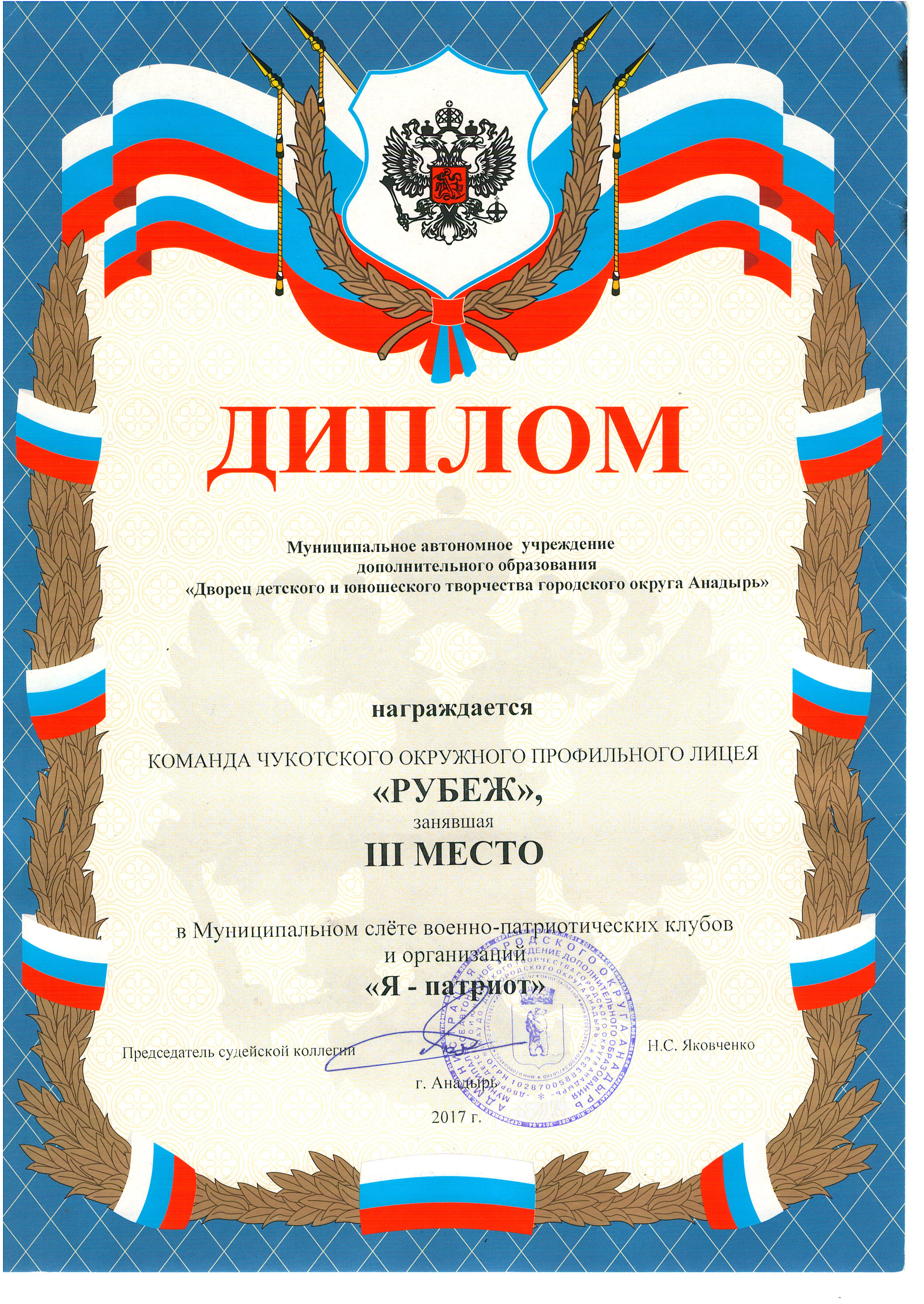 Учащиеся лицея приняли участие в муниципальном слете военно-патриотических клубов и организаций «Я-патриот», который проходил 17-18 ноября на базе Муниципального автономного учреждения дополнительного образования «Дворец детского и юношеского творчества городского округа Анадырь». Учредителем слёта выступила Администрация городского округа Анадырь, а непосредственным организатором стало МАУ ДО «ДДТ городского округа Анадырь». В программе слёта были творческие и военно-спортивные конкурсы. Наши ребята представляли визитную карточку, исполняли военно-патриотическую песню, подготовили фотостенд « Готов к труду и обороне», а также подготовили ролик «К службе в армии готов», который зрители оценили по достоинству. Достойно показали себя лицеисты и в таких военно-спортивных конкурсах, как неполная сборка и разборка АКМ, оказание первой медицинской помощи, надевание противогаза и ОЗК. Волю к победе и слаженность продемонстрировали наши участники в командном соревновании «Военно-спортивная эстафета». После подведения итогов всем командам были вручены сладкие призы.