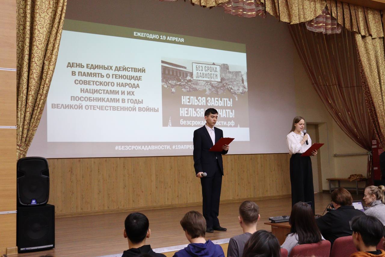 22 апреля в лицее состоялось мероприятие в память о геноциде советского народа нацистами и их пособниками в годы Великой Отечественной войны. В этом году исполняется 80 лет со дня принятия Указа Президиума Верховного Совета СССР № 39 «О мерах наказания для немецко-фашистских злодеев, виновных в убийствах и истязаниях советского гражданского населения и пленных красноармейцев, для шпионов, изменников родины из числа советских граждан и для их пособников».