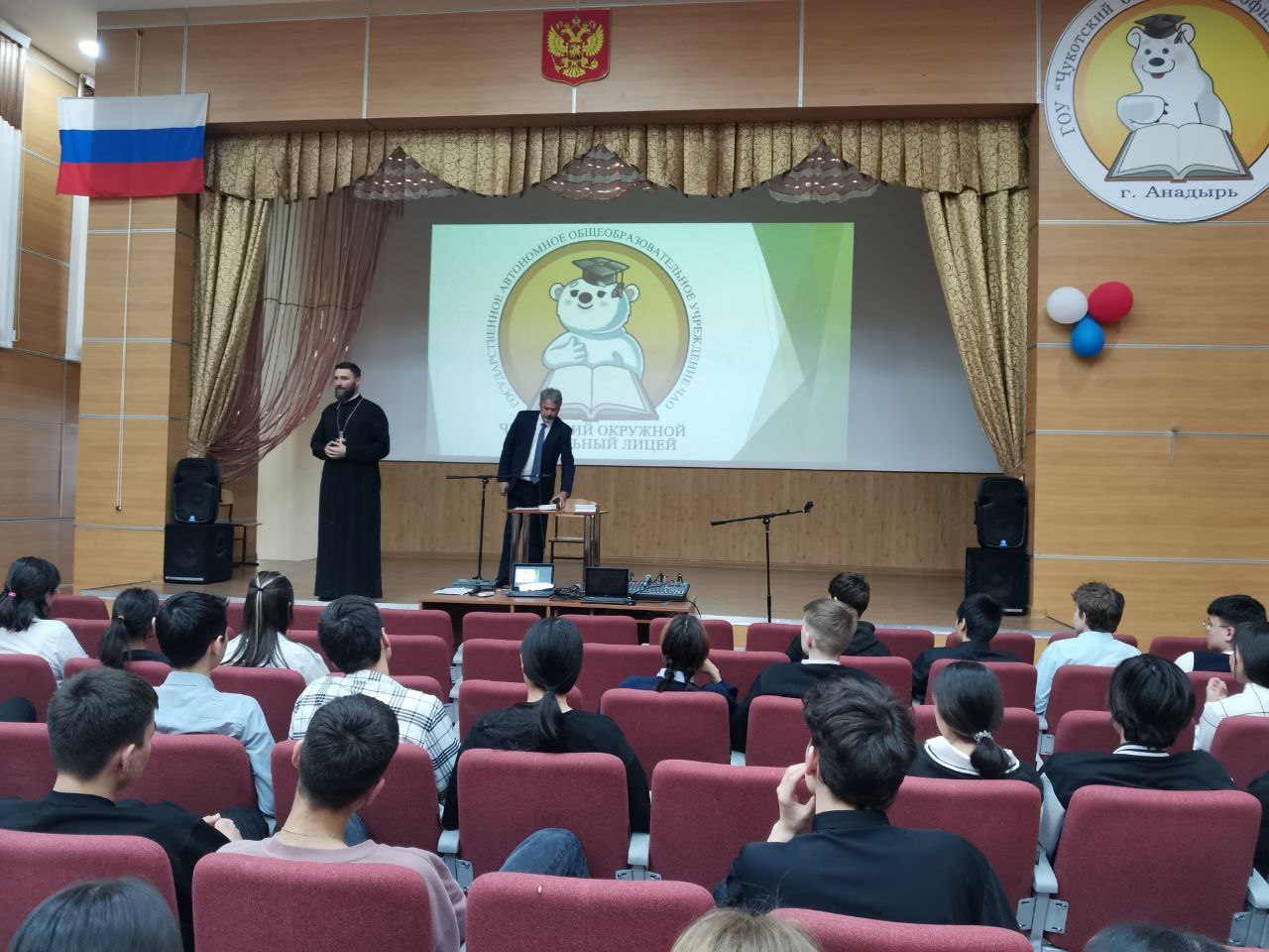 17 мая состоялась встреча обучающихся лицея с преподавателем Российского Православного Университета (г. Москва) и Перервенской православной духовной семинарии (г. Москва) Солодковым А. И.  Беседа прошла в рамках программы «Духовная безопасность России» при активном содействии Анадырской и Чукотской  епархии. Андрей Иванович  в ходе встречи затронул различные аспекты   взаимоотношений современной науки и христианского мировоззрения. Духовная безопасность – одна из актуальных проблем нашего времени, одна из главнейших для человека, семьи и напрямую имеет отношение к самореализации личности.