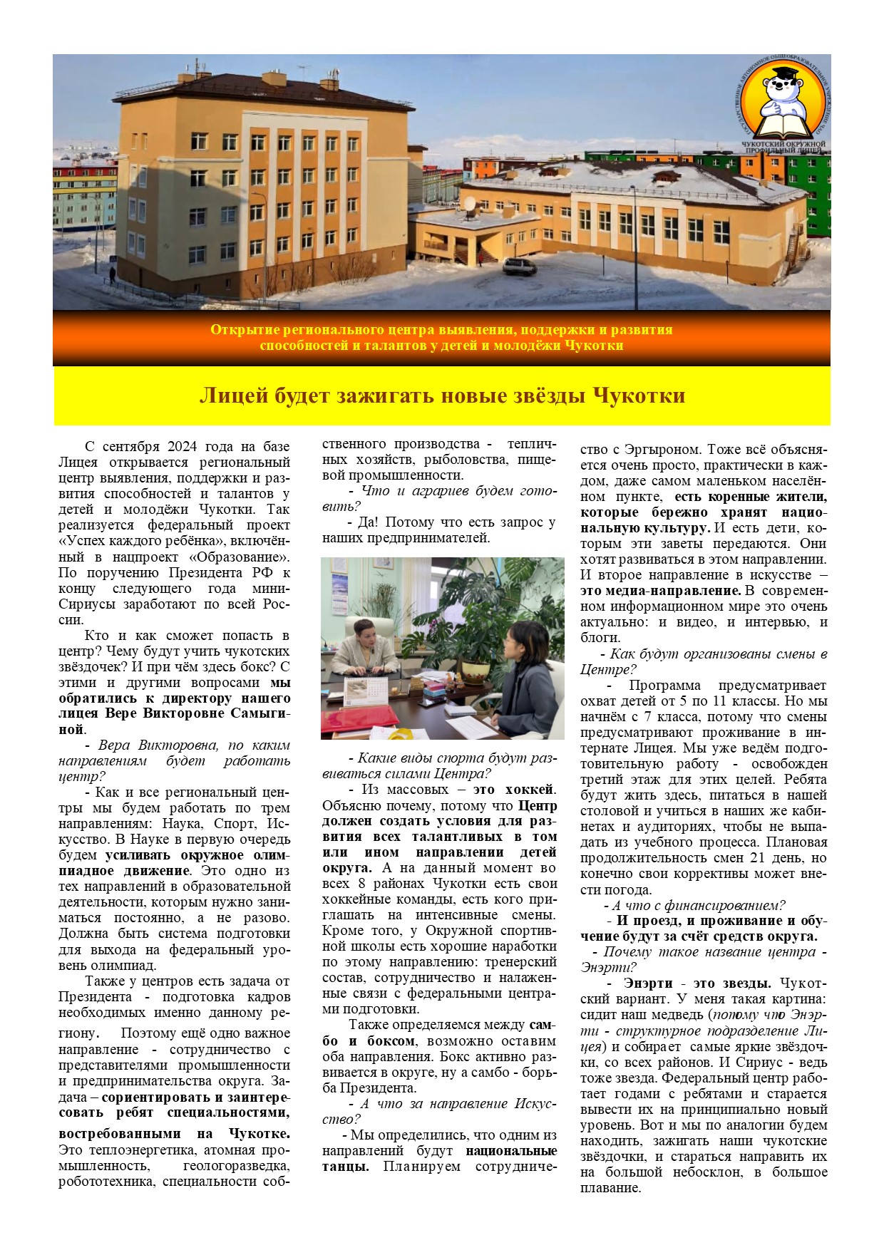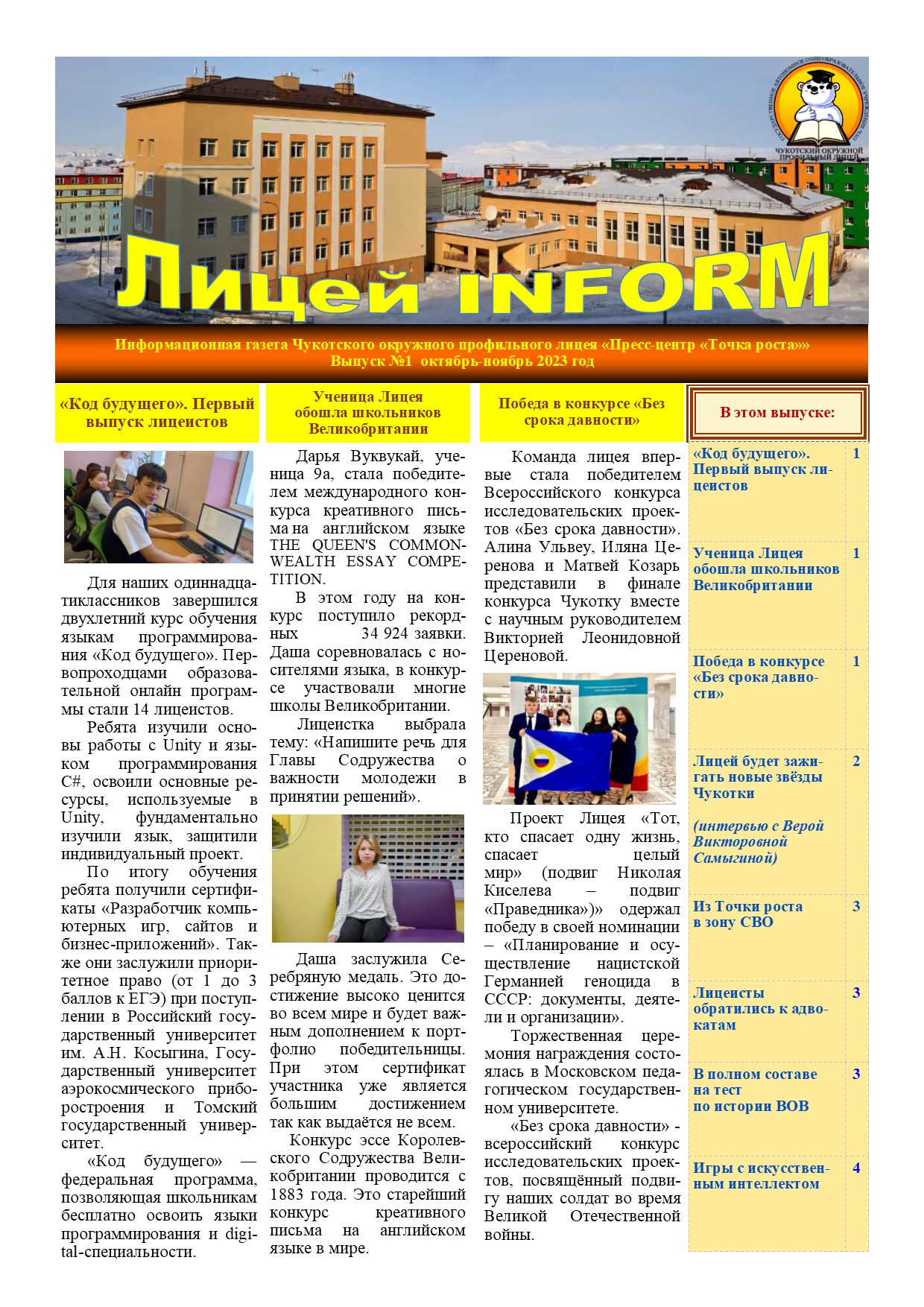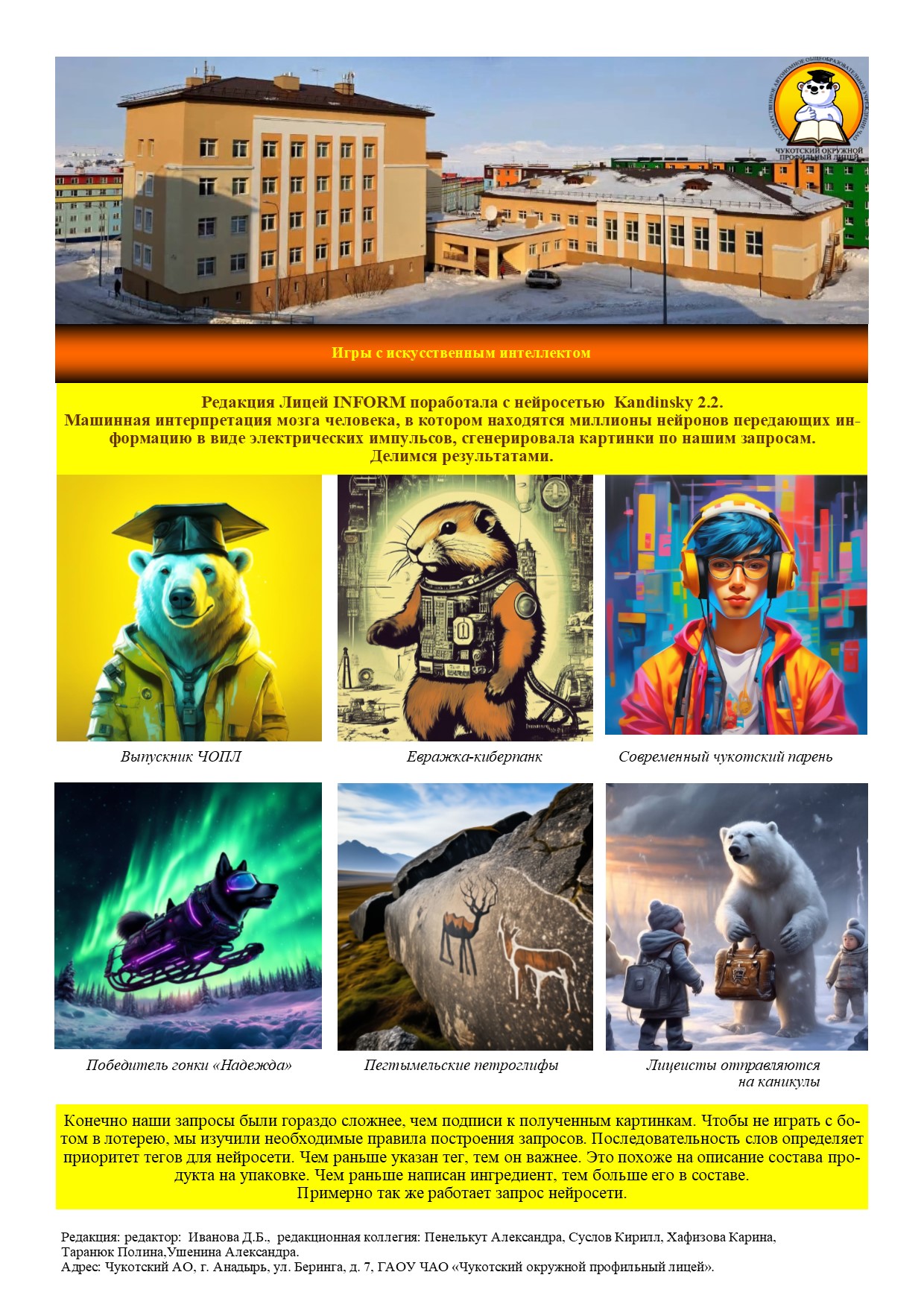 Первый выпуск газеты "Лицей-INFORM" сезона 2023/2024 состоялся. Новый состав пресс-центра отработал главные новости прошедшей осени, взял обширное интервью у директора Веры Викторовны Самыгиной на тему грядущего открытия Центра "Энэрти", особое внимание уделил поддержке СВО. Последний разворот ребята посвятили играм с нейросетью Kandinsky 2.2. и приложением Шедеврум. Машинная интерпретация мозга человека, в котором находятся миллионы нейронов передающих информацию в виде электрических импульсов, сгенерировала картинки по запросам ребят.