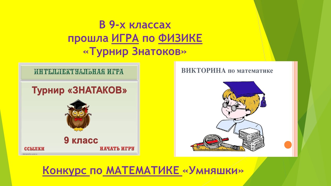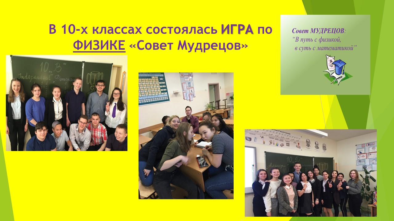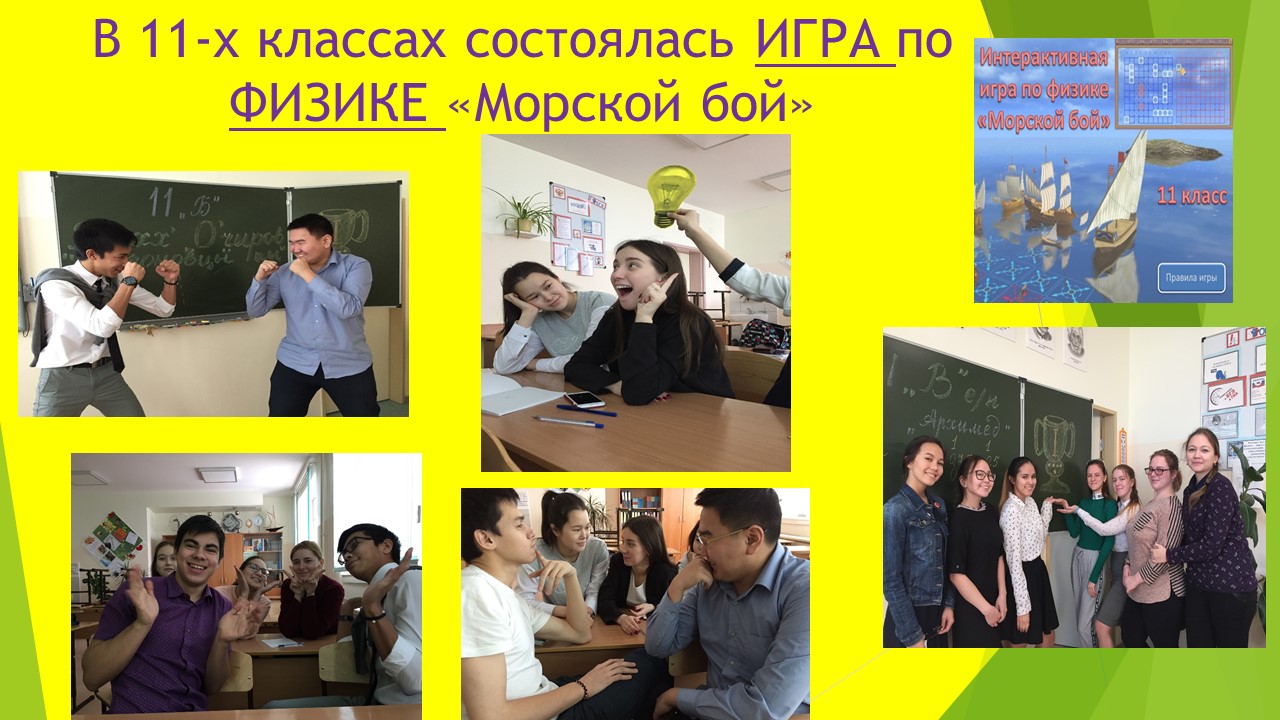 Мартыненко Ирина Сергеевна учитель физики организовала игу на первенство среди 9-ых классах «Турнир знатоков», а также Интерактивная игра «Морской бой» в 11 –ых классах, «Времена года» в 8-ых классах, «Совет мудрецов» в -10-ых классах, конкурс презентаций «Энциклопедия одного термина» будет продолжаться до конца февраля.