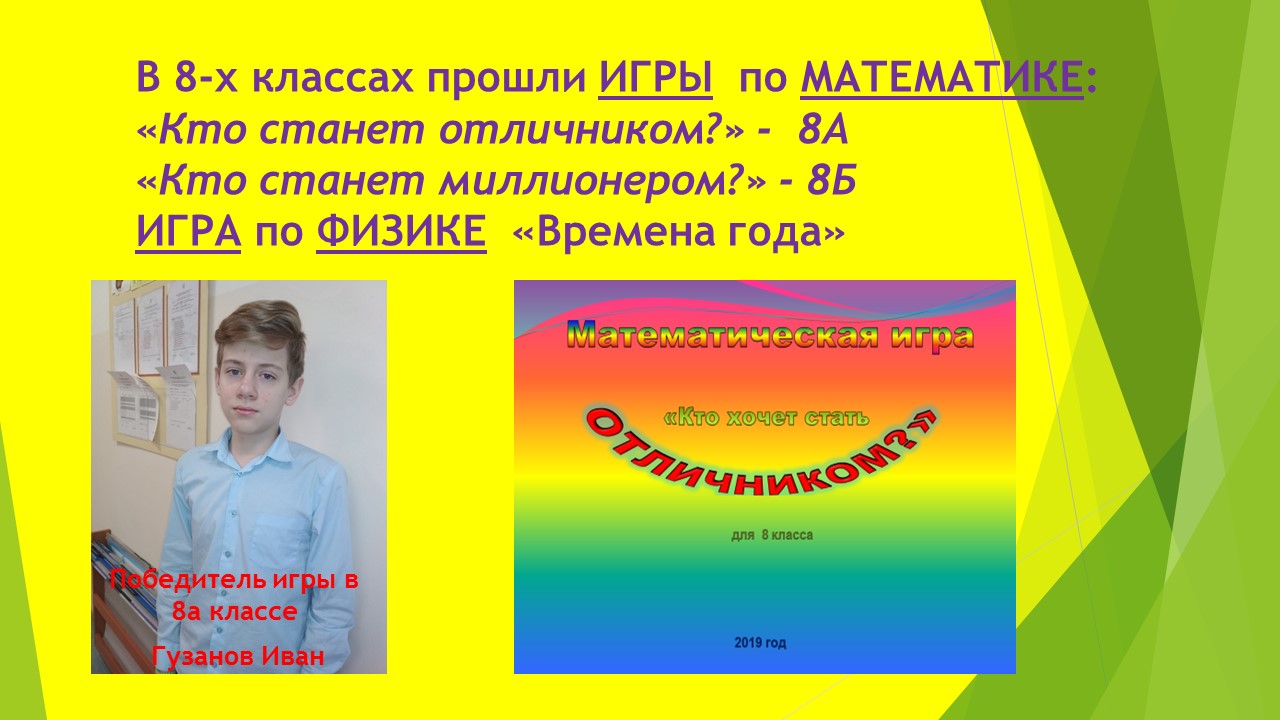 - Награждены грамотами учащиеся 8-ых классов за участие в командной игре «Времена года»: 8 «А» класс- первое место, 8 «Б» класс- второе место в игре «Кто хочет стать отличником?» Гузанов Иван.