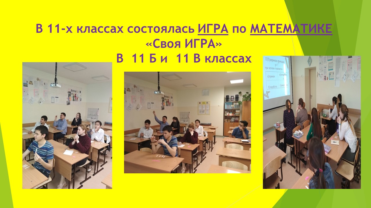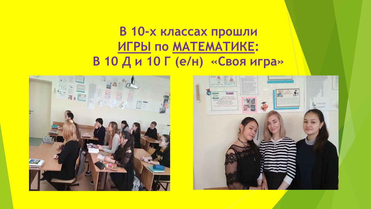 Ершова Марина Ивановна учитель математики организовала внеклассные мероприятия «Своя игра» и «Математическая викторина», в 10-11 классах, в 8 «А» классе была проведена игра «Кто хочет стать отличником?», а также для учащихся 8-го «А» класса были предложены учителем творческие домашние задания «Ребусы, шарады, рисунки по координатам»