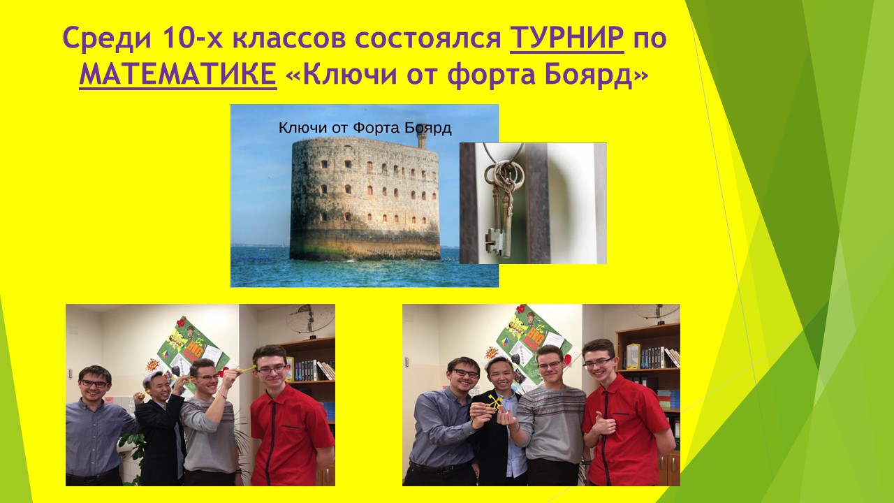 - Награждены команды 10-ых классов за победу в интеллектуальной игре «Совет мудрецов»: 10 «В» -первое место, 10 «Б» - второе место; за победу в игре «Ключи от форта Бояр» команда 10 «В» класса –за первое место, 10 «Д» класс –а второе место, 10 «А» класс за третье место.