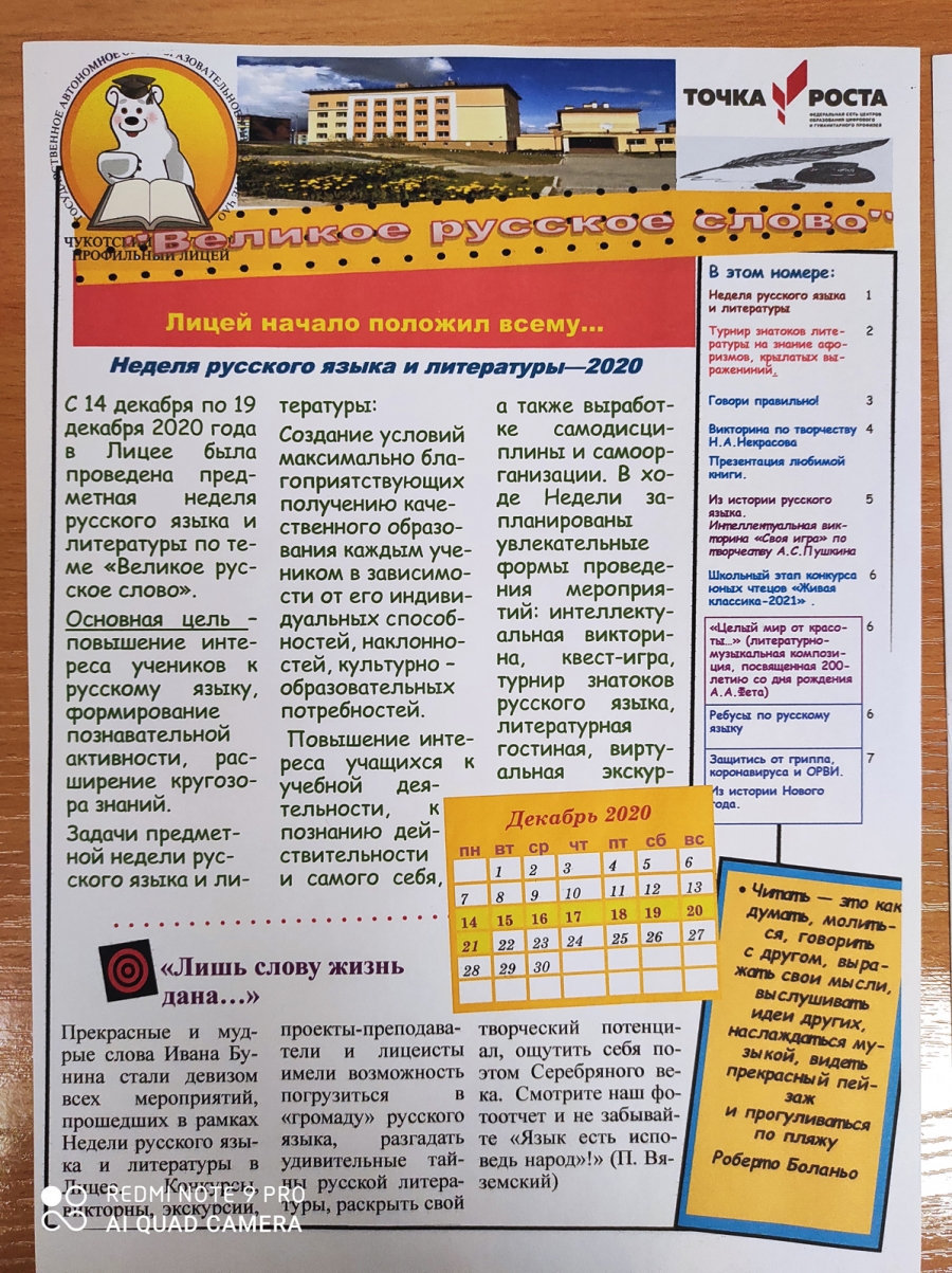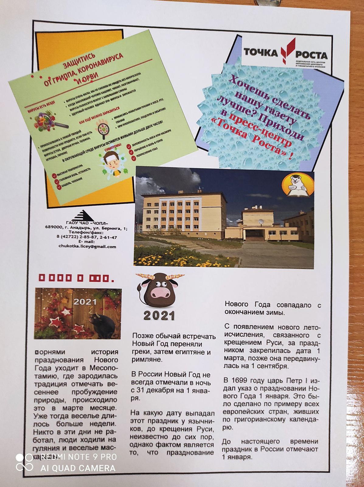 Потребность в печатной лицейской прессе получила воплощение в нашем Лицее в 2020 году, когда на базе  Чукотского окружного профильного лицея  был создан Центр образования цифрового и гуманитарного профилей "Точка роста",   кружок «Пресс-центр «Точка Роста»».  Благодаря юным корреспондентам  Пресс-центра, газета наполнена интересными материалами, отражает кипучую жизнь Лицея. Участники пресс-центра «Точка Роста» освещали такие мероприятия, как интеллектуальная викторина, квест-игра, турнир  знатоков русского языка, литературная гостиная, посвящённая 200-летию А.Фета, презентация любимой книги, отборочный тур юных чтецов «Живая классика», также провели опрос среди лицеистов на соблюдение орфоэпических норм русского языка. Итогом работы стал первый выпуск лицейской газеты, над которым трудились все участники кружка  «Пресс-центр «Точка Роста»».