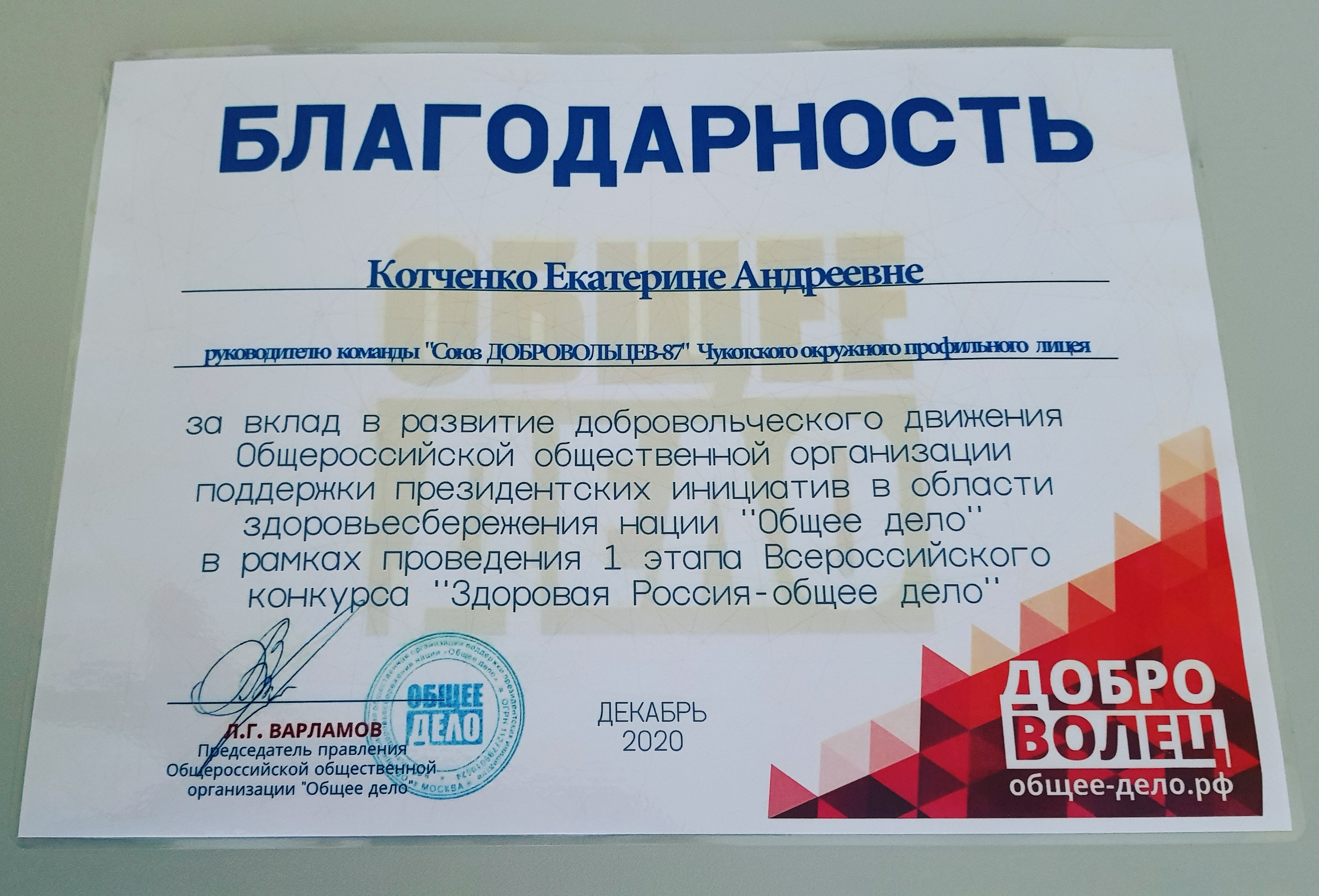 Ребята команды «Союз Добровольцев-87», обучающиеся по программе «Я - лидер» Центра образования цифрового и гуманитарного профилей «Точка роста», принимали участие в I этапе Всероссийского конкурса «Здоровая Россия – общее дело», учредителем которого является Общероссийская общественная организация поддержки президентских инициатив в области здоровьесбережения нации «Общее дело». Ребята провели 12 лекций-бесед с обучающимися лицея по профилактике употребления психоактивных веществ среди молодёжи, просматривали интересные вебинары и фильмы подготовленные общественной организацией, проходили обучение на платформах