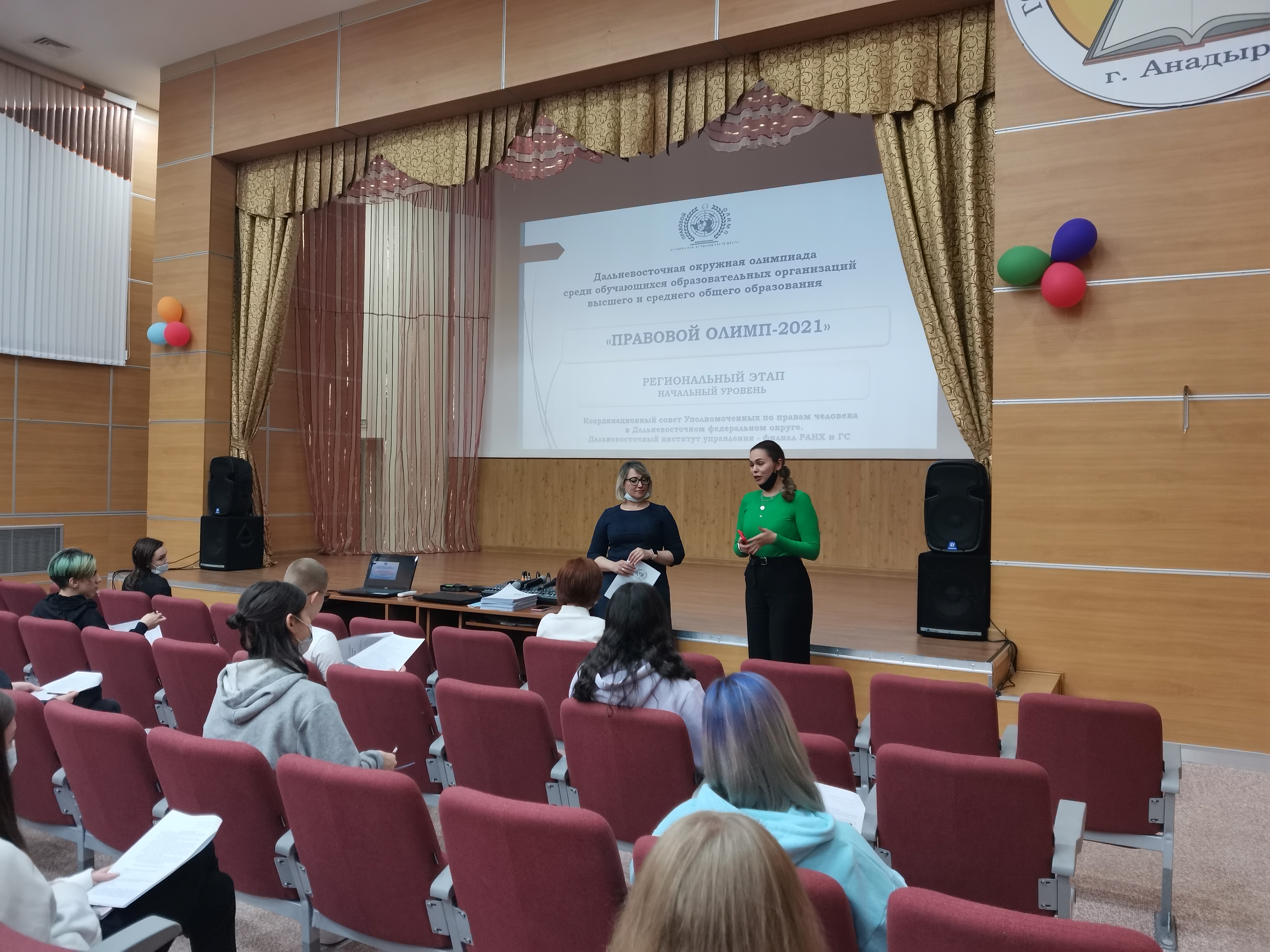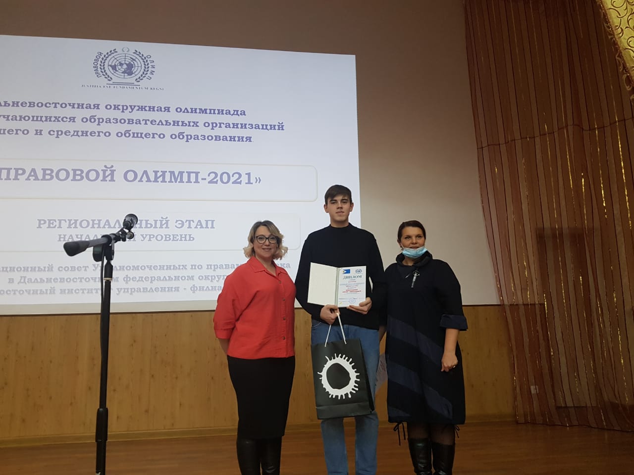 54 лицеиста стали участниками Регионального тура Дальневосточной окружной олимпиады среди обучающихся образовательных организаций высшего и среднего общего образования «Правовой Олимп-2021». Учредителями олимпиады являются Дальневосточный институт управления – филиал федерального государственного бюджетного образовательного учреждения высшего образования «Российская академия народного хозяйства и государственной службы при Президенте Российской Федерации» и Координационный совет Уполномоченных по правам человека в Дальневосточном федеральном округе. Олимпиада проводилась при поддержке Уполномоченного по правам человека в Чукотском автономном округе. Одна из целей проведения олимпиады – привлечение молодежи к обсуждению проблем в области правового регулирования. По итогам заседания оргкомитета и жюри олимпиады 7 лицеистов из числа учащихся 10-11-х классов стали призерами, а учащийся 10 класса социально-экономического профиля вошел в тройку победителей. 19 ноября Уполномоченный по правам человека в Чукотском автономном округе в торжественной обстановке в актовом зале лицея вручила ребятам дипломы.
