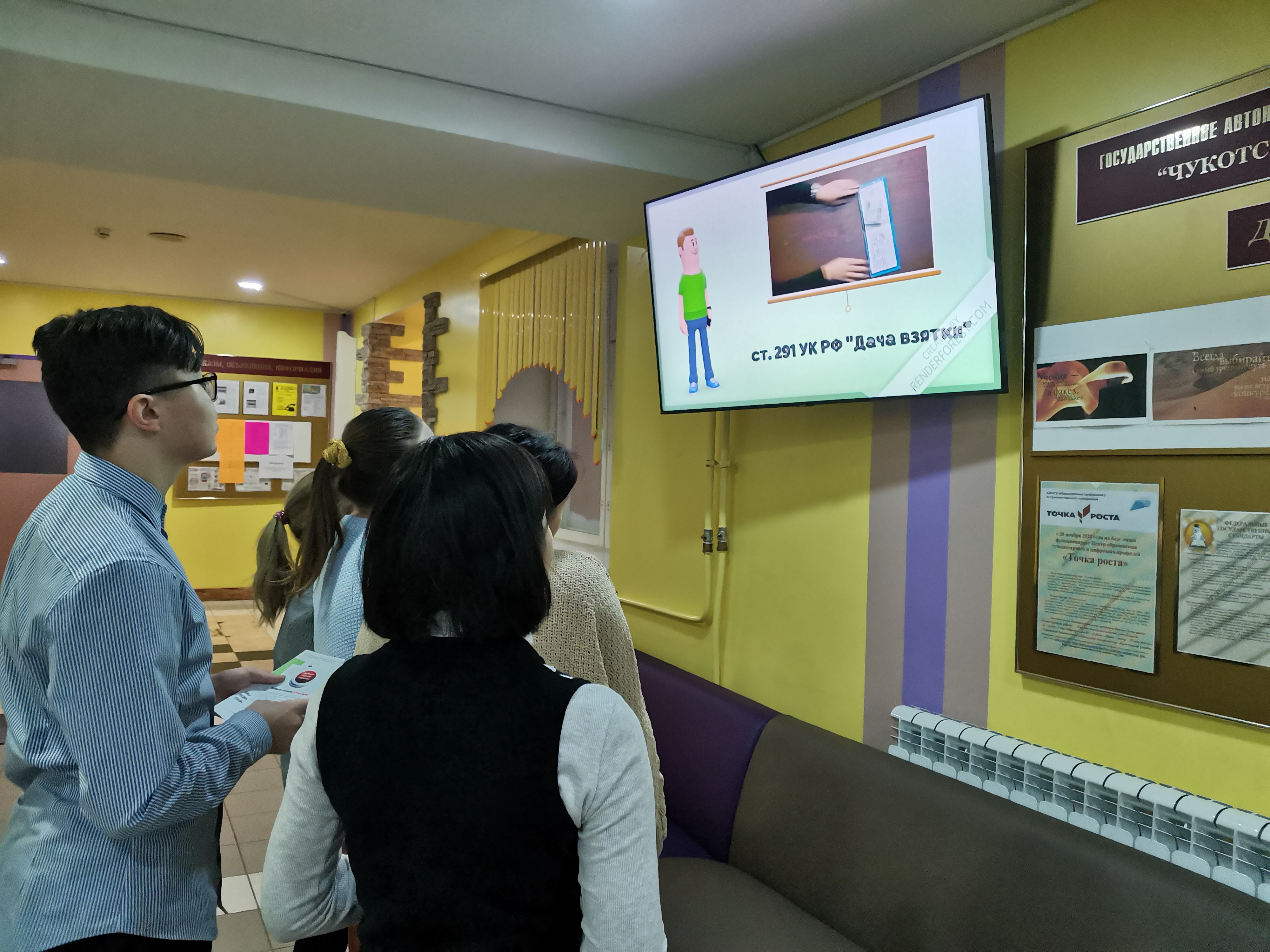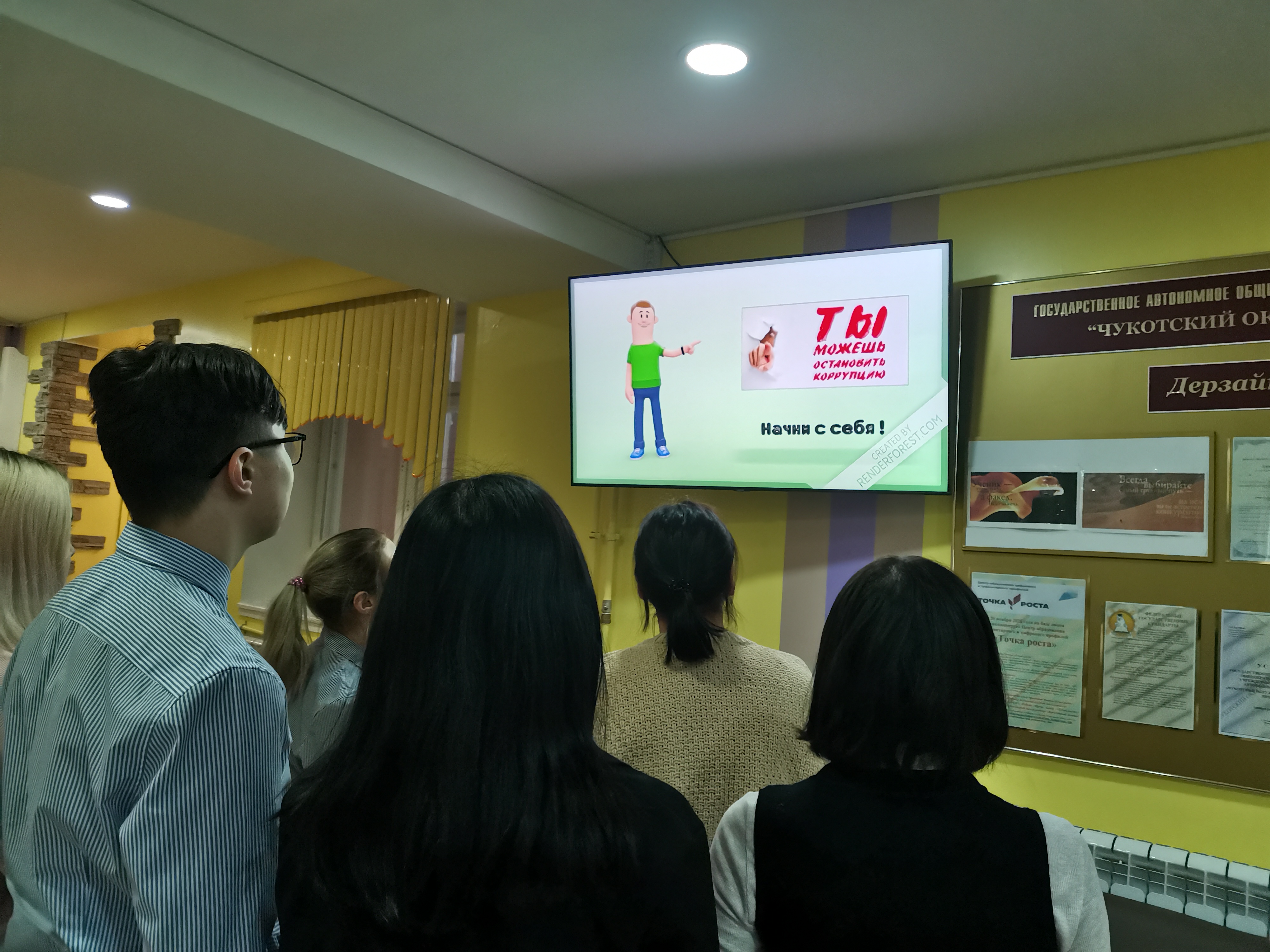 В целях создания условий для воспитания ценностных установок и развития способностей, необходимых для формирования у обучающихся  гражданской позиции в отношении коррупции в Чукотском окружном профильном лицее прошли мероприятия, приуроченные к Международному дню борьбы с коррупцией 09 декабря 2021 года.  Старшеклассники приняли участие в  региональном флешмобе «Мы против коррупции!». В течение всего дня 9 декабря в холле 1 этажа лицея на телеэкране  демонстрировались антикоррупционные ролики. Волонтеры РДШ  раздавали  антикоррупционные памятки и буклеты учащимся, а также посетителям лицея.    Данные акции проведены при содействии  Управления по профилактике корруппционных и иных правонарушений Чукотского автономного округа, предоставившего футболки с тематическими надписями и раздаточный материал. В этот же день  старший помощник Анадырского межрайонного прокурора провела для учащихся лицея викторину. С 30 ноября по 8 декабря классными руководителями проведены классные часы и  беседы по темам борьбы с коррупцией с использованием видеосюжетов и презентационного материала. В библиотеке лицея оформлена выставка и проведена беседа с учащимися на тему «Коррупция  в литературных произведениях русских писателей». На уроках права, экономики и обществознания в течение недели педагоги акцентировали внимание на антикоррупционном законодательстве.