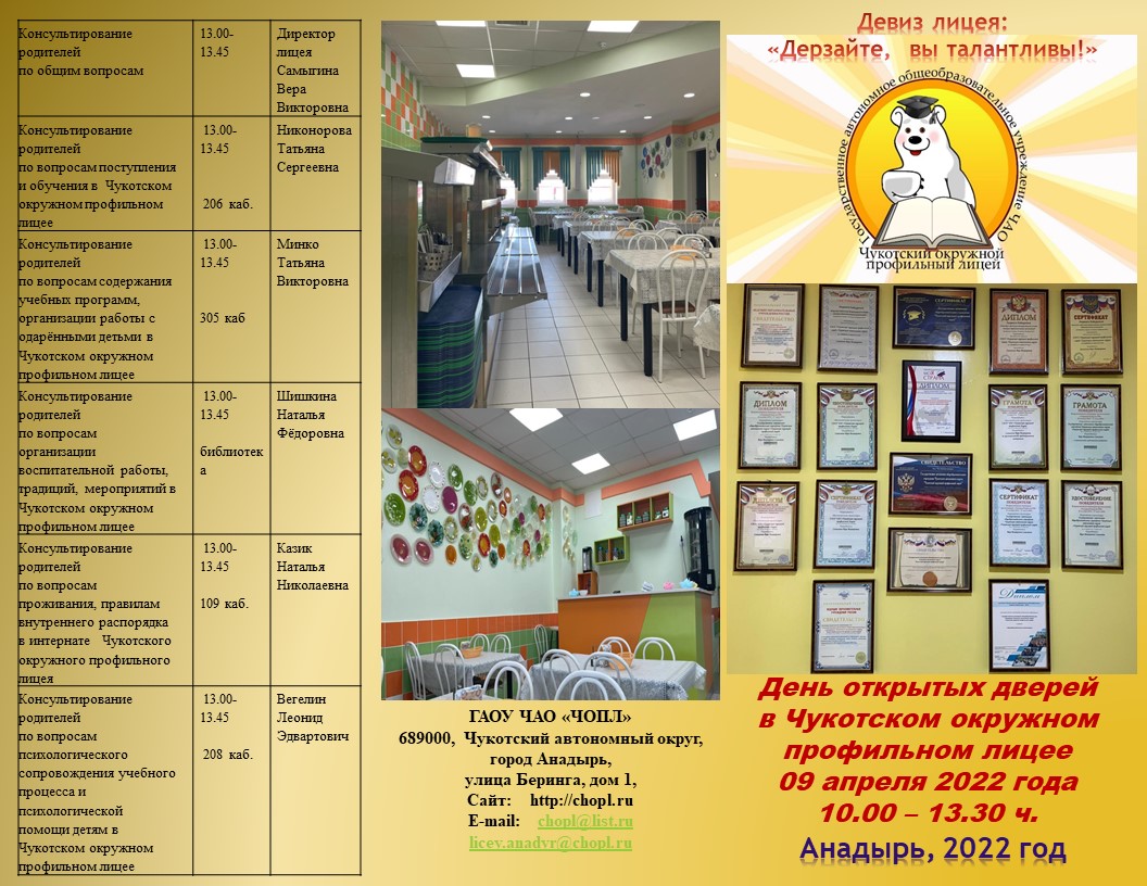 Чукотский окружной профильный лицей приглашает всех желающих на День открытых дверей 09 апреля 2022 года в 10.00 часов. В программе:
