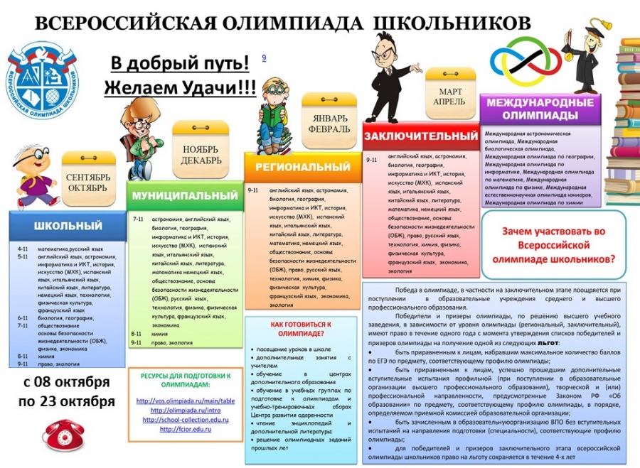 Олимпиады школьного этапа были проведены по следующим предметам: русский язык, литература, математика, история, обществознание, география, биология, химия, физика, английский язык, информатика, основы безопасности жизнедеятельности. Школьный этап Всероссийской олимпиады проводился с 09 октября по 24 октября 2017 года.